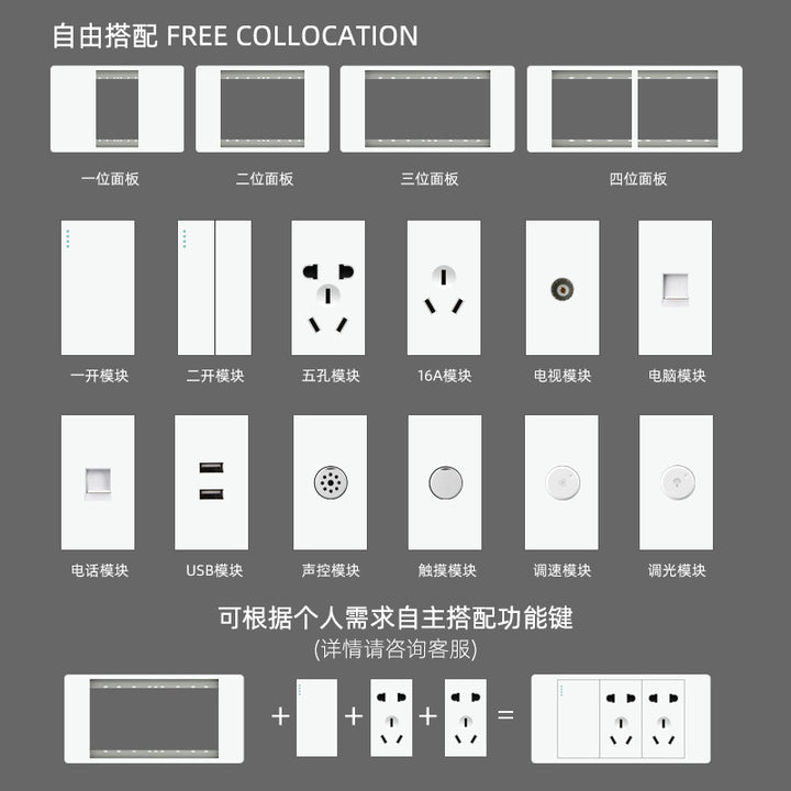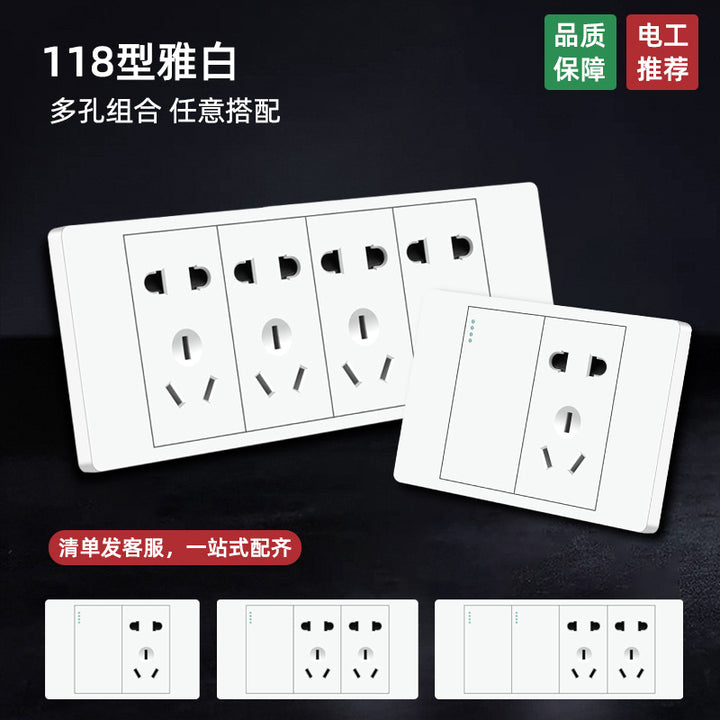 Elegant white one-piece panel, Elegant white two-position panel, Elegant white three-panel, Elegant white four-position panel, Small five-hole socket module, One open double control switch module, One open multi-control switch module, TV socket module, Computer/Network Outlet Module, 16A air conditioner socket module, Small two open double control module, Small three open module (2 bits), Ten-hole socket module, Speed control switch module, Acousto-optic switch module, USB socket module, Blank Panel Module, 118 type five-hole socket (one plug), 118 type single open double control (one open finished product), 118 type ten hole socket (two plug finished product), 118 type one open with five holes (finished product), 118 type two open double control (finished product), 118 type air conditioner socket (finished product), 118 type TV + network socket (finished product), 118 type one-open multi-control belt with five holes (finished product), 118 type 15 hole socket (finished product), 118 type one-open double control belt 10 holes (finished product), 118 type one-open multi-control belt 10 holes (finished product), 118 type two open tape 5 holes (finished product), Type 118 TV with 10 holes (finished product), 118 type network with 10 holes (finished product), 118 type TV + network + 5 holes (finished product), 118 type three open double control (finished product), 118å20å(ęå), 118 type one-open double control belt 15 holes (finished product), 118 type one-open multi-control belt 15 holes (finished product), 118 type TV + 15 holes (finished product), 118 type network + 15 holes (finished product), 118 type TV + network + 10 holes (finished product), 118 type four-open double control (finished product), 118 type five-open double control (finished product), 118 type four: six open (finished product), 118 type four-digit: seven open (finished product), 118 type four-digit: octave (finished product) |