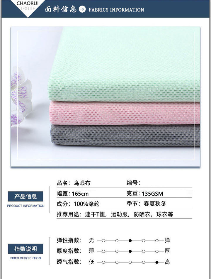 135G all-polyester bird's eye cloth 75d three-level t-shirt fabric, moisture-absorbing and sweat-wicking function, sports quick-drying elastic mesh...