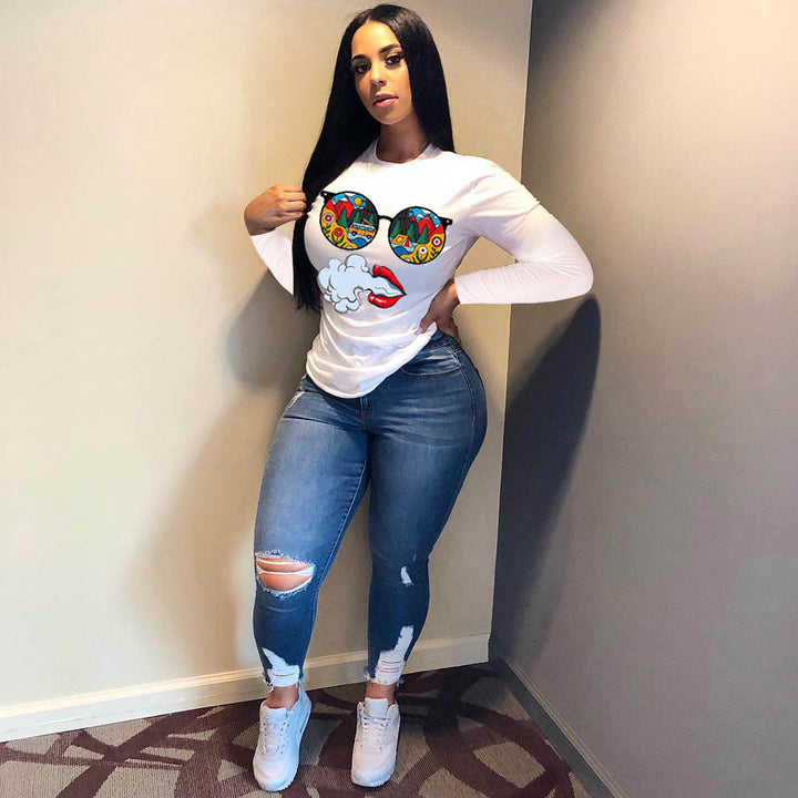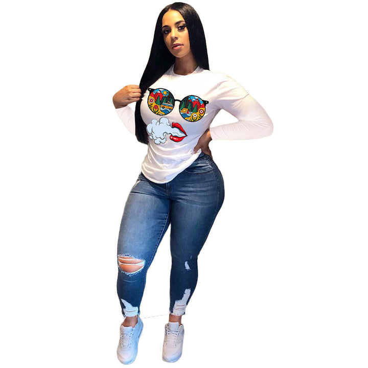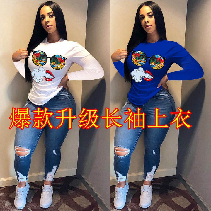 2020 Cross-border European and American Women's Long Sleeve Crew Neck Casual Printed T-Shirt Loose Top Women's T-Shirt