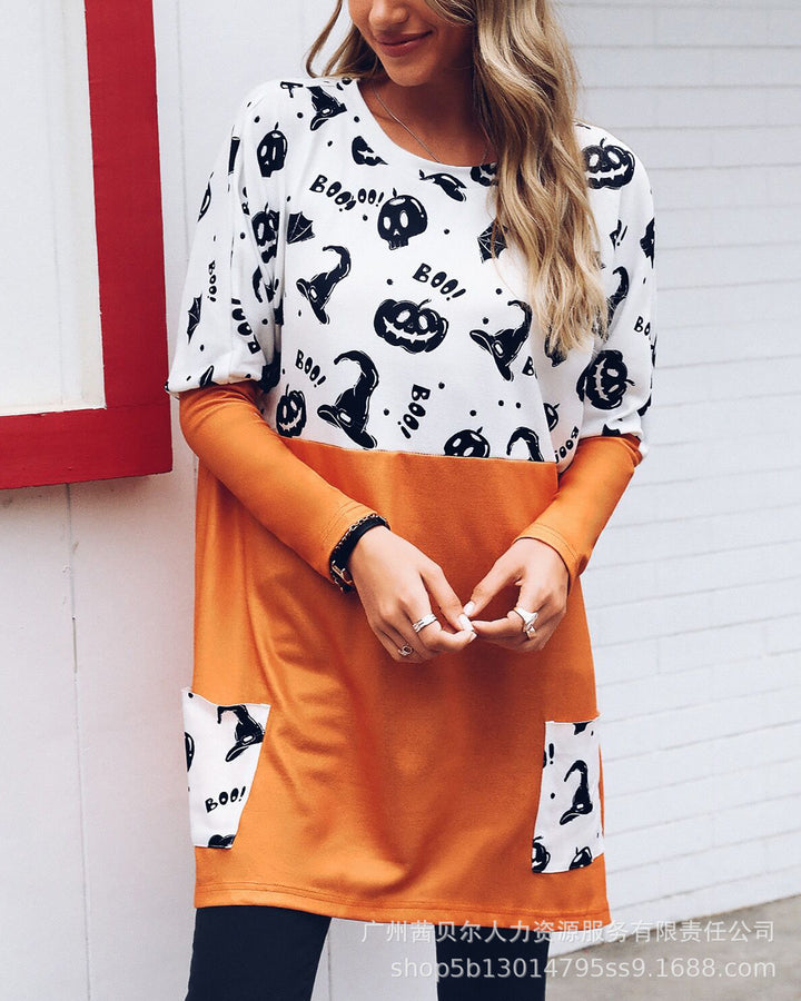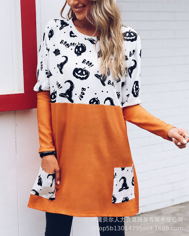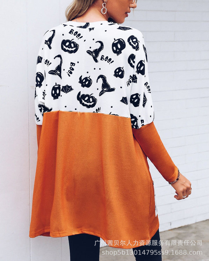 2022 European and American women's clothing new round neck long-sleeved splicing Halloween printed T-shirt top