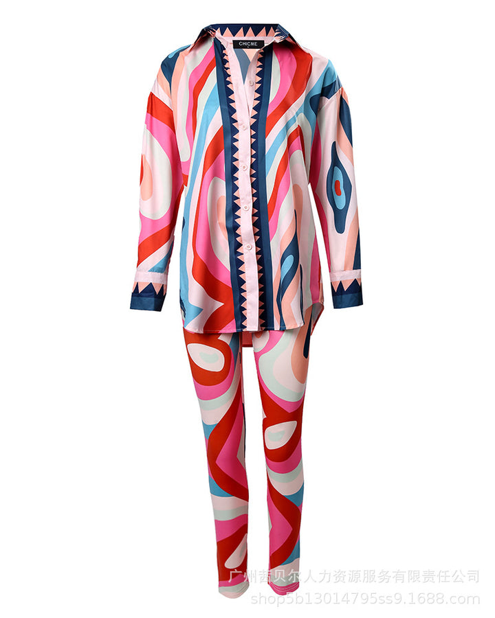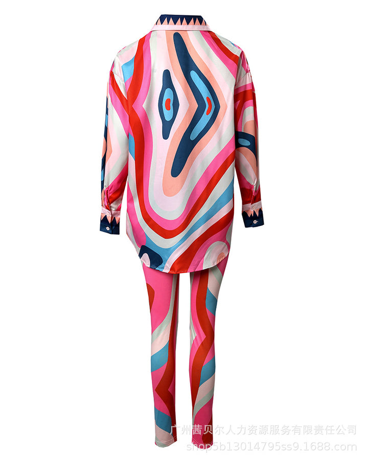 2023 abstract contrasting color printing casual fashion shirt suit leggings - not positioned