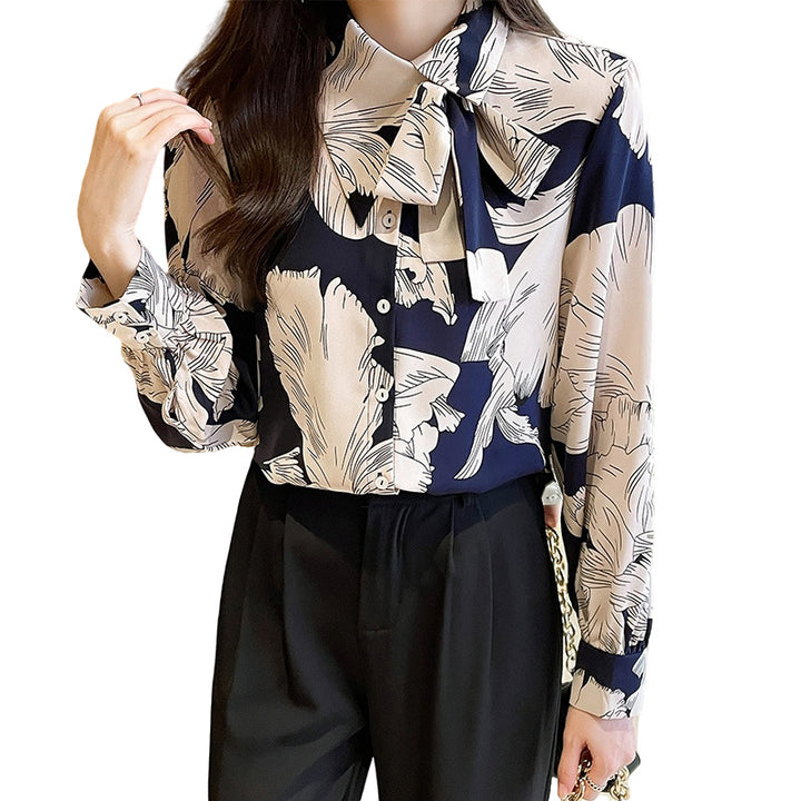 2024 autumn new design sense contrasting color large flower streamer asymmetrical lapel long-sleeved shirt versatile high sense