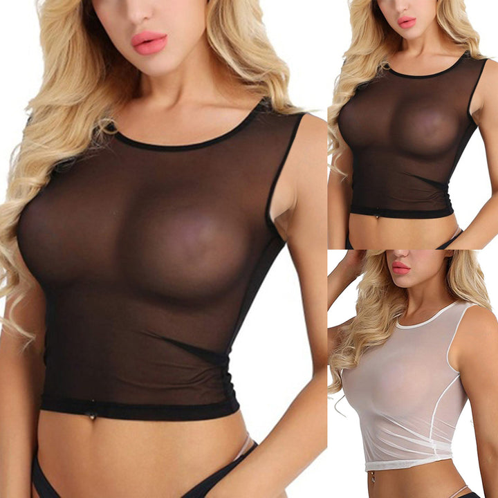 2024 European and American women's mesh yarn shows great perspective, sexy and tight-fitting transparent trade temptation short top