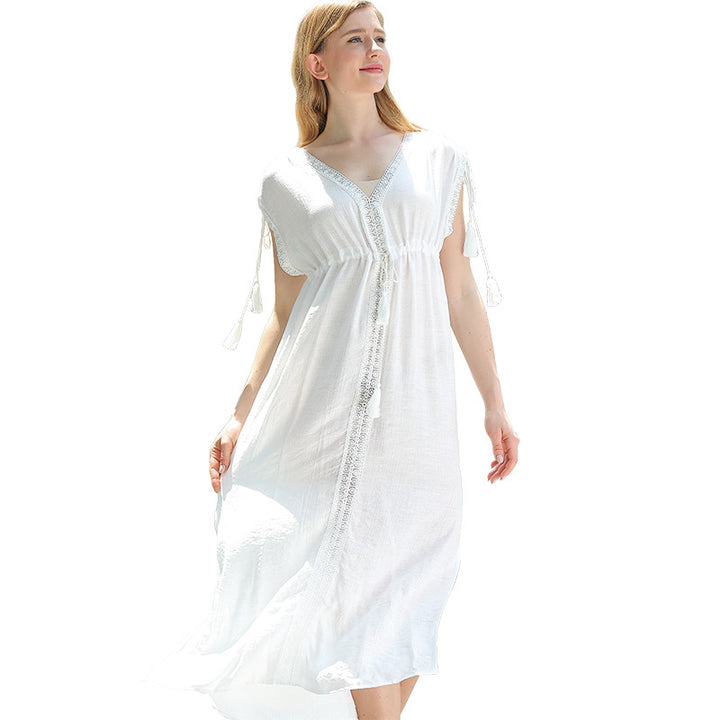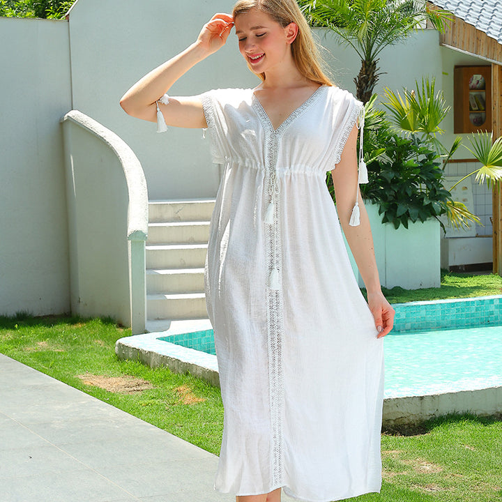 2024 fashion women's clothing splicing lace sexy deep V-neck vacation sunscreen long dress blouse dress