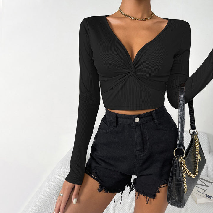 2024 Foreign Trade International Station Hot Sale V-Neck Long Sleeve T-Shirt Autumn and Winter Niche Simple Design Slim Top Women
