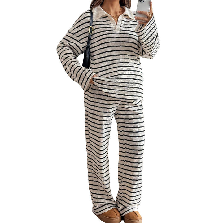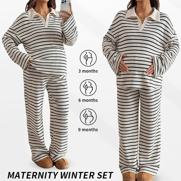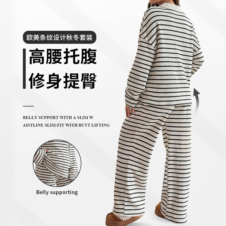2025 Europe, America, autumn and winter striped lapel fashion knitted loose long-sleeved top casual trousers maternity suit