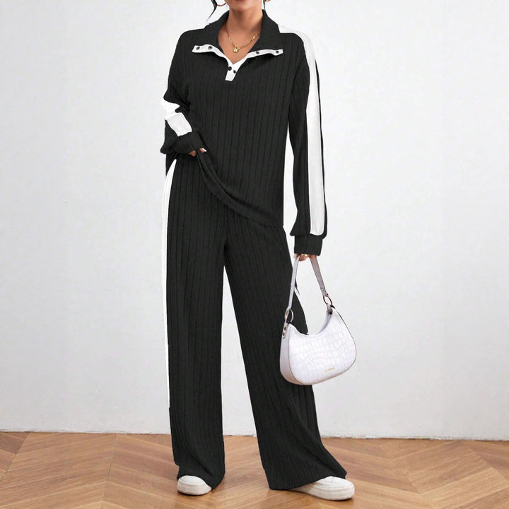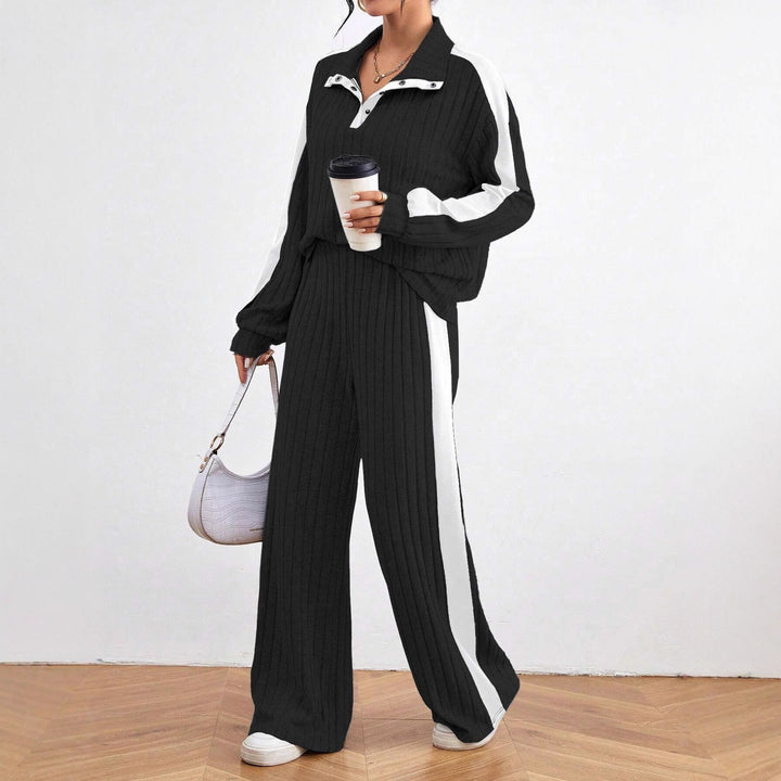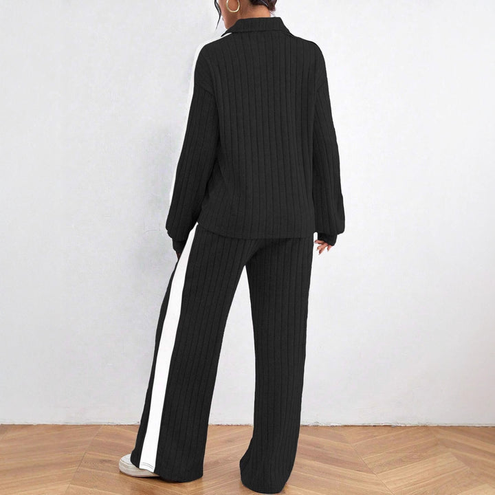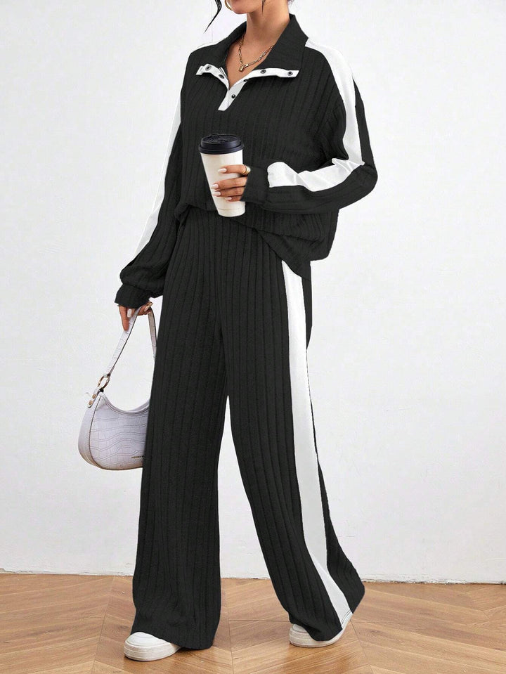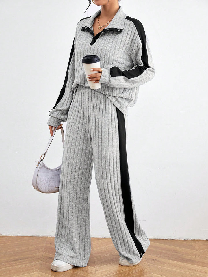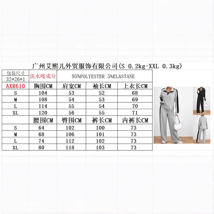 2025 Europe, America, fashion casual polo collar color matching design loose sweater wide-leg pants two-piece set