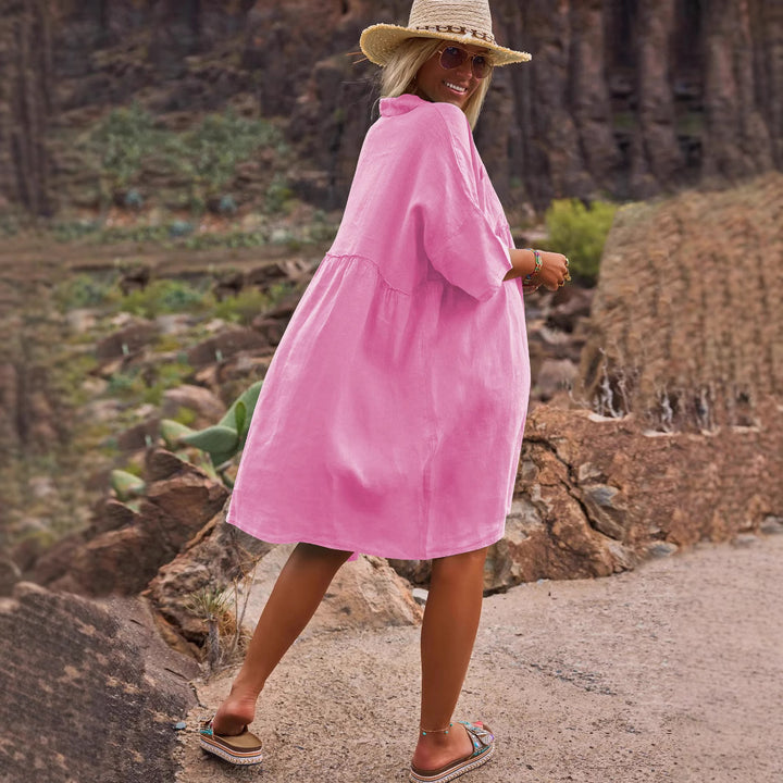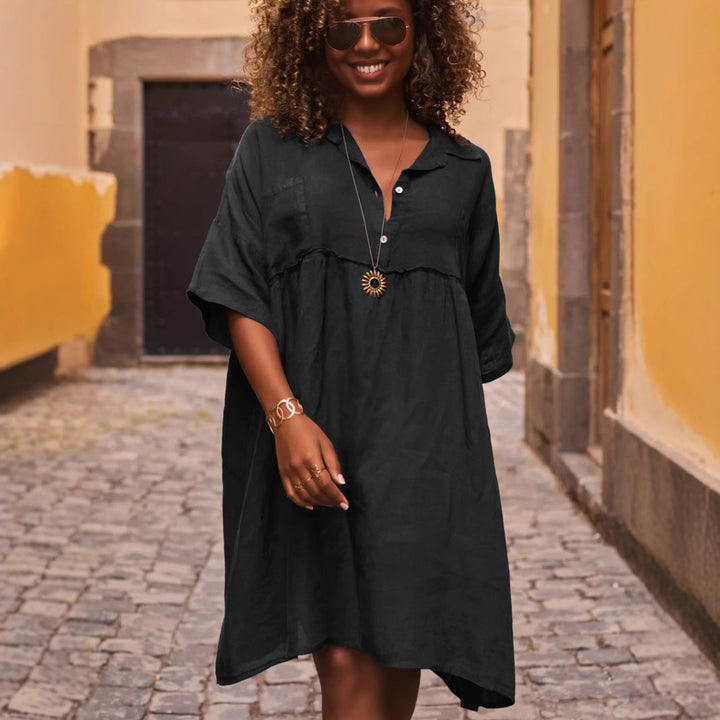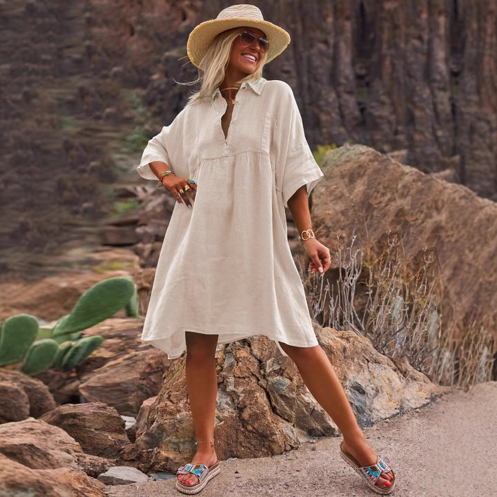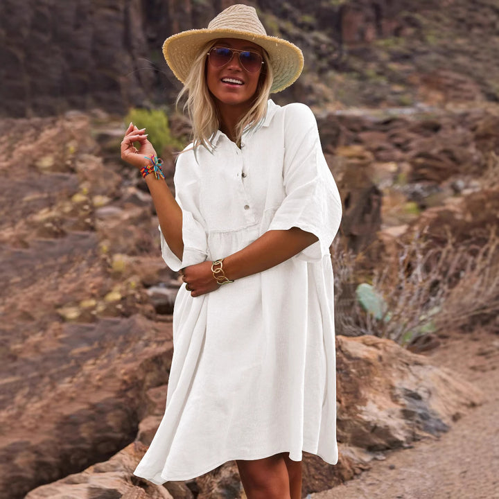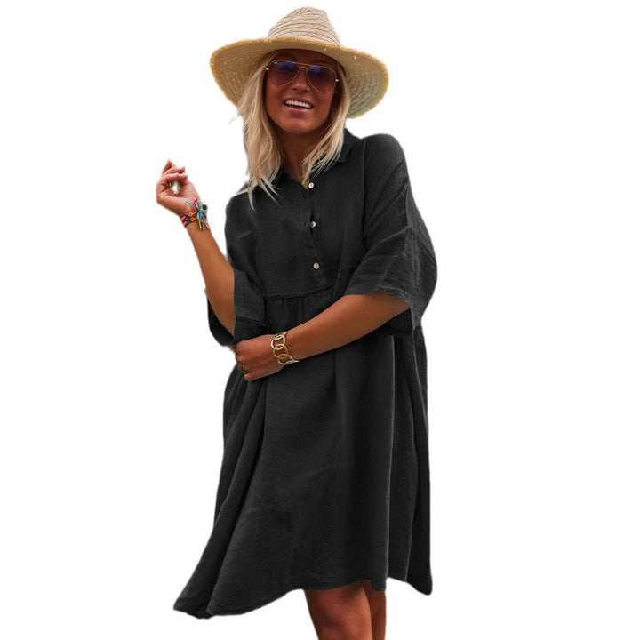 2025 European and American women's clothing loose solid color polo collar vacation casual buttons literary and artistic fashion dress women