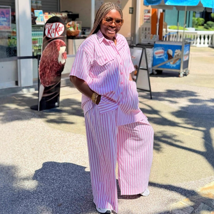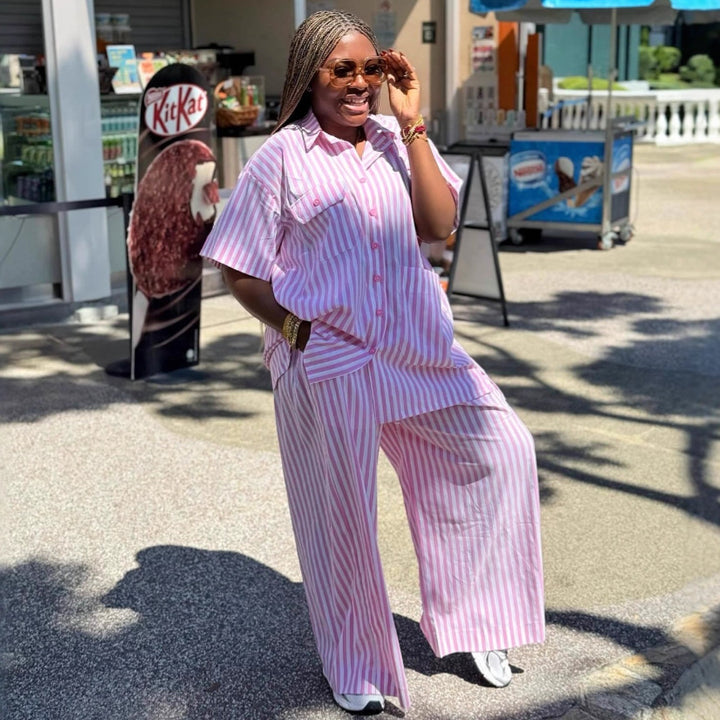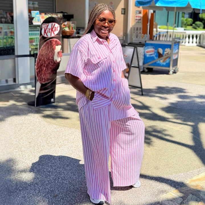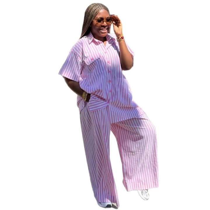 2025 European and American women's clothing short-sleeved lapel striped breasted shirt African fashion foreign casual trousers two-piece set women