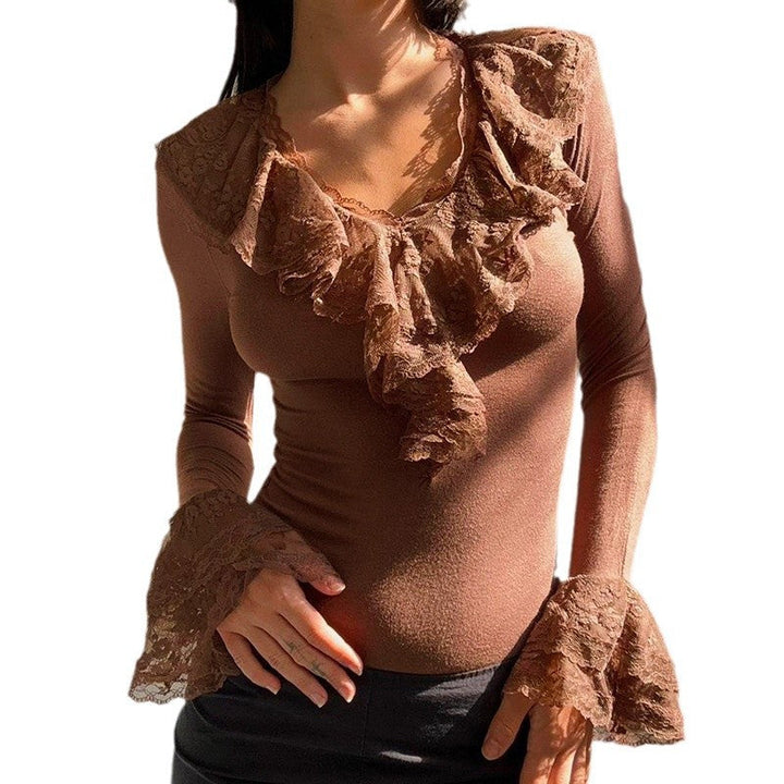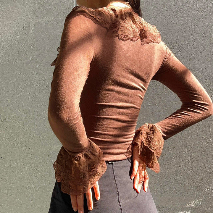 2025 Spring and Autumn European and American Cross-border New Solid Color Design Sense Lace Splicing Horn Sleeve Bottom Top Long Sleeve T-Shirt