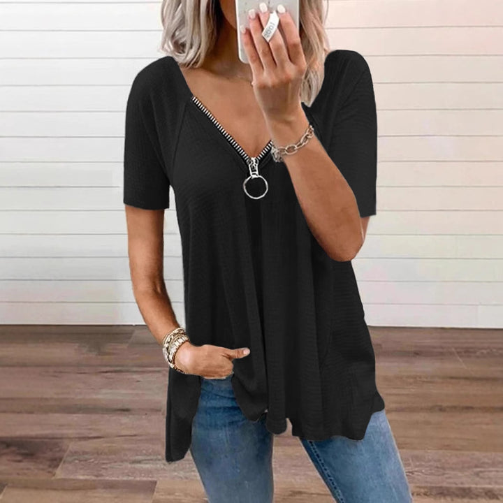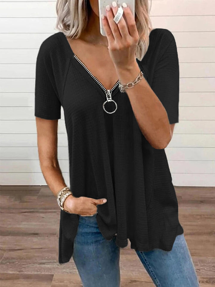 2025 summer new European and American large-size women's casual T-shirt solid color V-neck zipper loose short-sleeved top