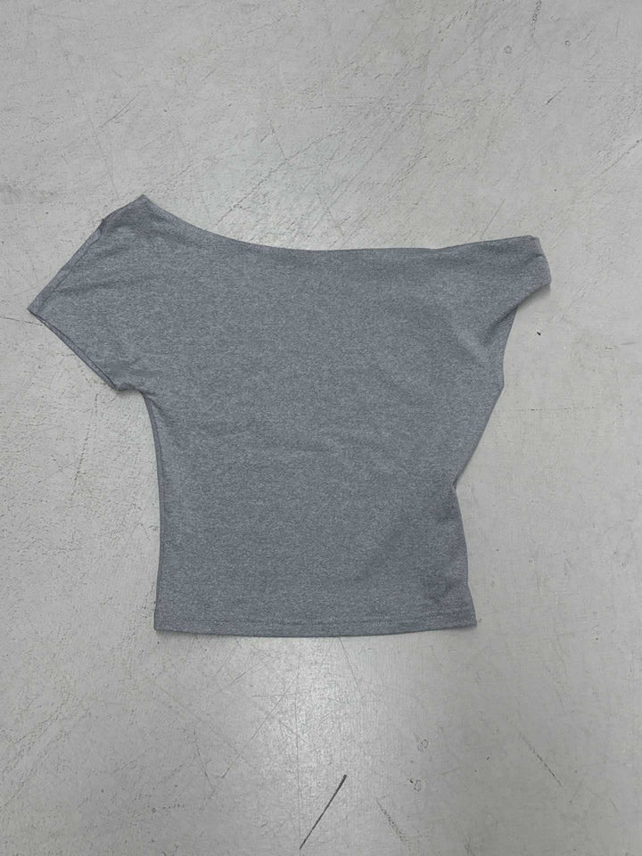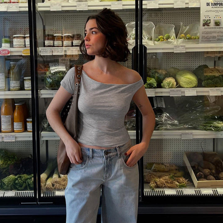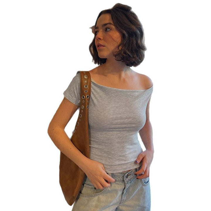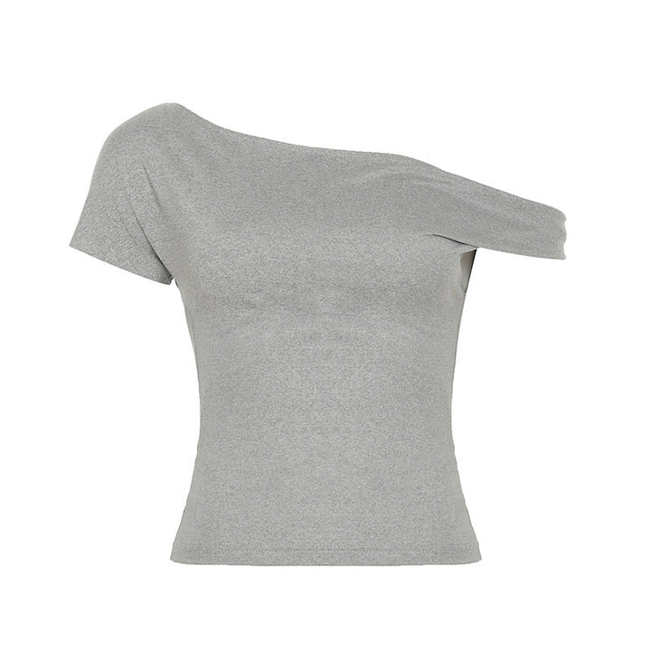 2025 summer new solid color basic slanted shoulder short sleeve irregular simple casual T-shirt off-shoulder short top women