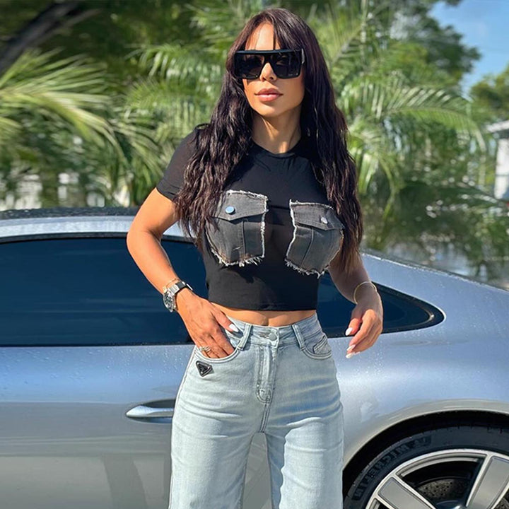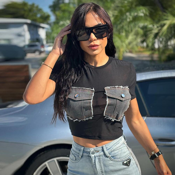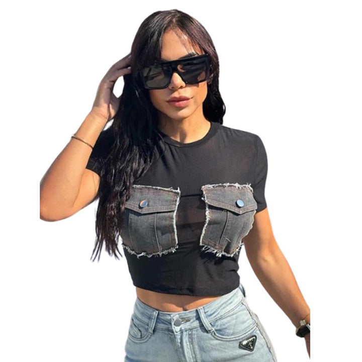 32161THY special for 2024 autumn new products, exposed umbilical tassel washing water splicing mesh yarn, European and American tops, women