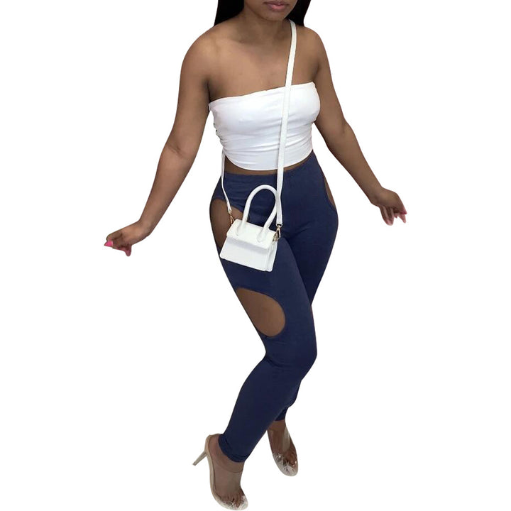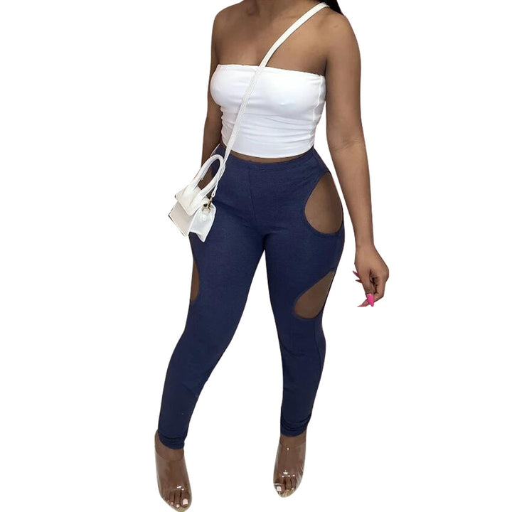 5449 2021 new personalized hollow solid color beltless tight pencil spring and summer casual trousers