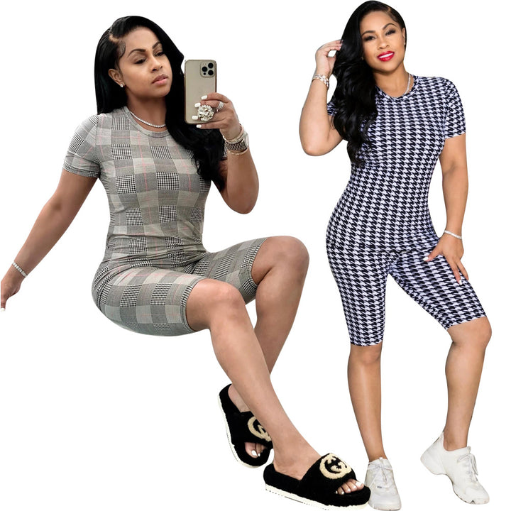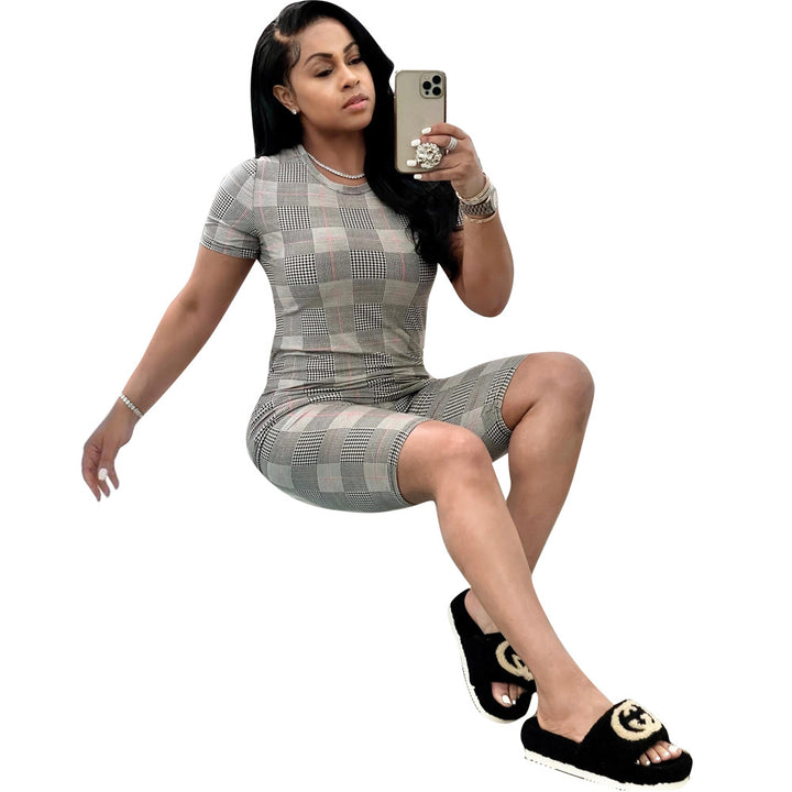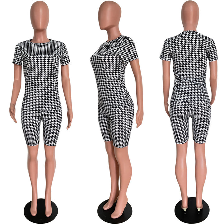 5480 European and American fashion casual suit, thousand bird grid printed casual t-shirt, two-piece set of five-point pants, summer