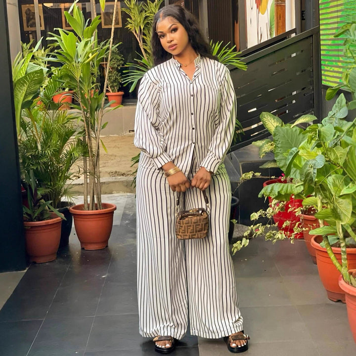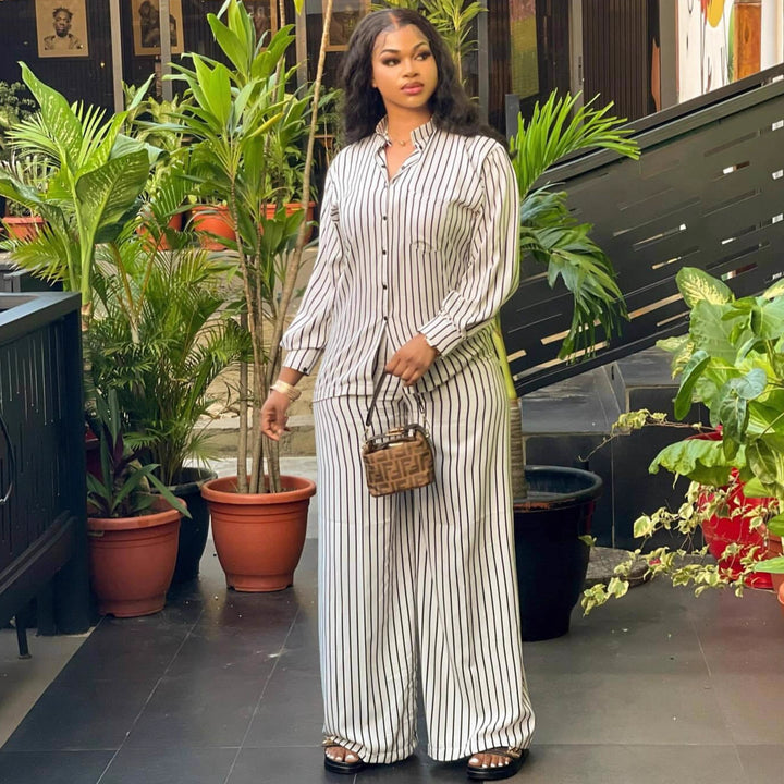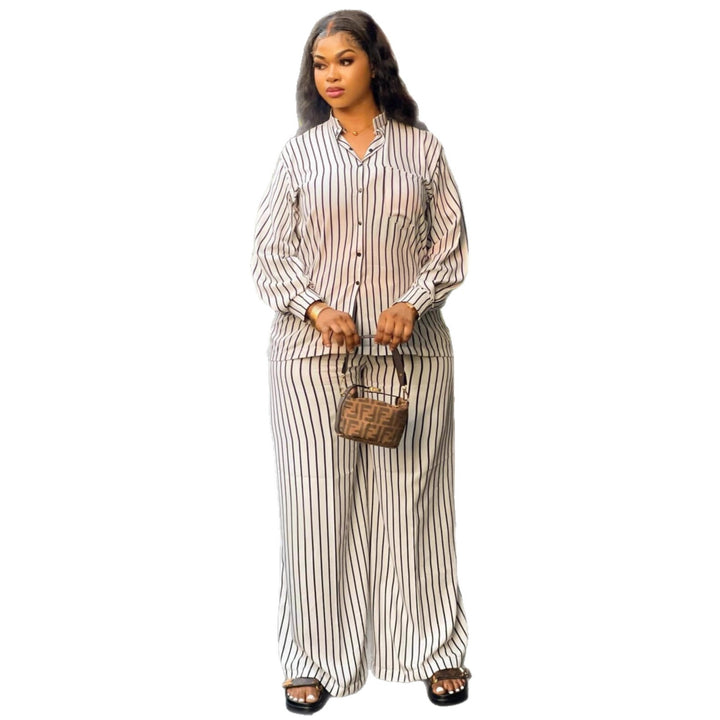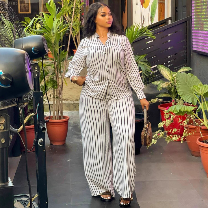 African large size women's lapel collar striped loose long-sleeved shirt women's European and American fashion casual trousers new two-piece set