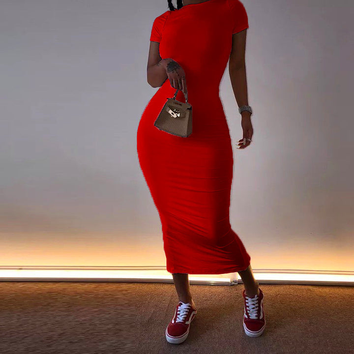 AL093 Independent Station European and American Women's Clothing Solid Color Dress Vacation Casual Long Dress Short Sleeve T-Shirt Dress Sexy