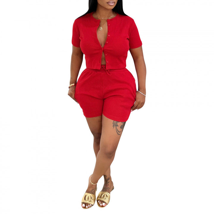 AL326 Cross-border European and American Women's Clothing Two-piece Set Short Sleeve T-Shirt Jacket Set Summer Threaded Sports Hot Pants