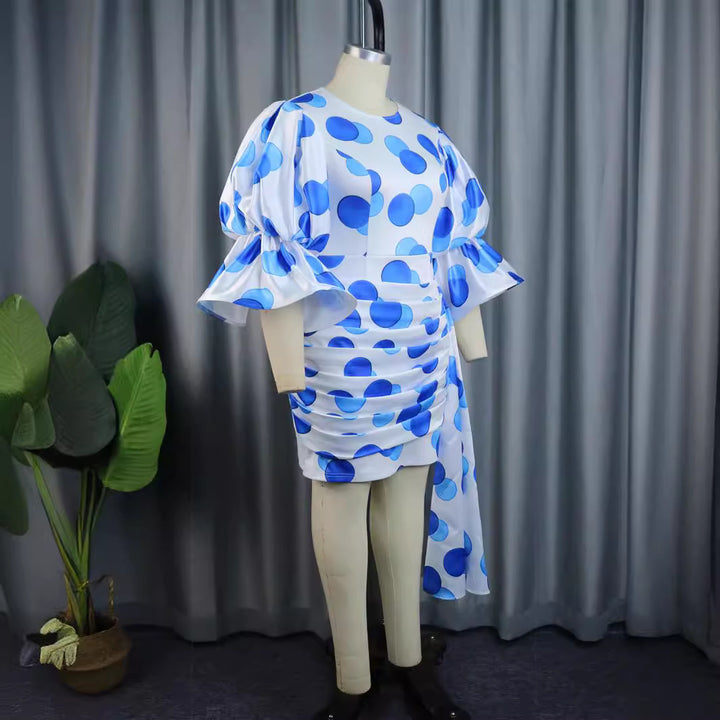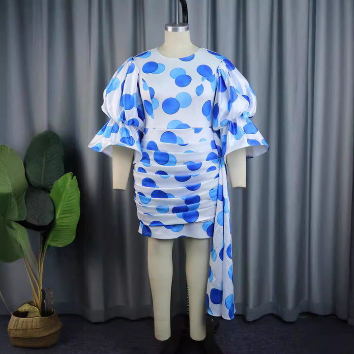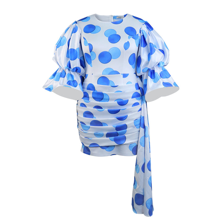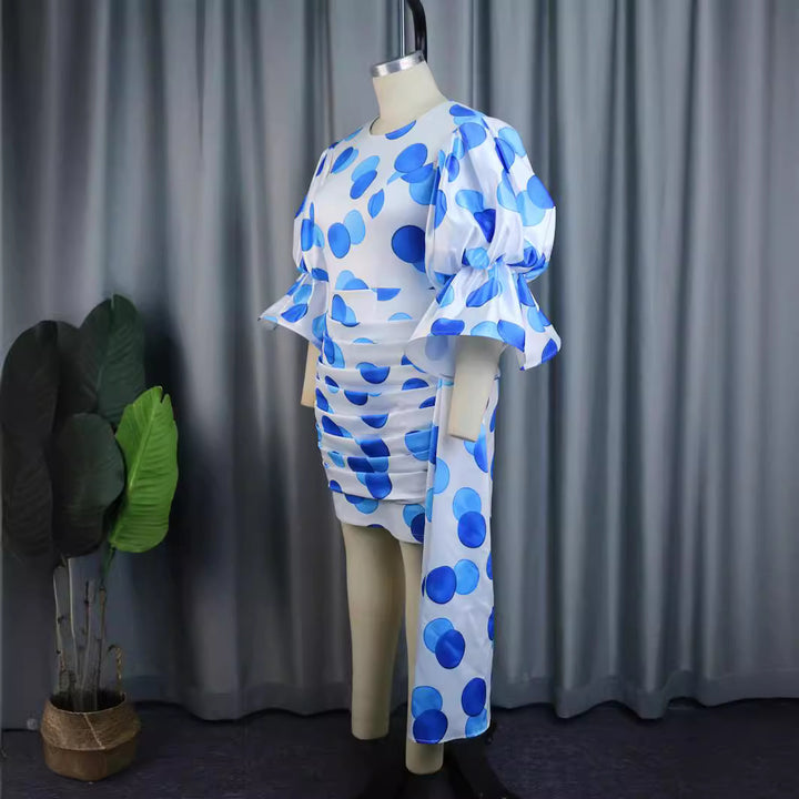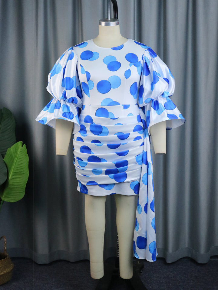 AM030213 Casual crew neck flared sleeve dress, polka dot streamer pleated hip skirt dresses