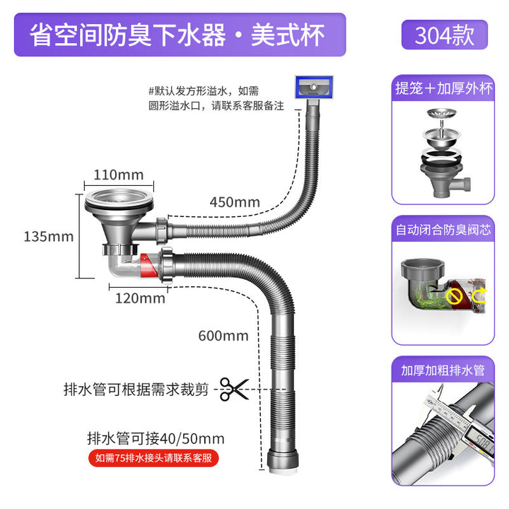 American cup overflow pipe integrated sewer, kitchen large single-slot drain pipe, anti-odor and anti-blocking sewer manufacturer wholesale