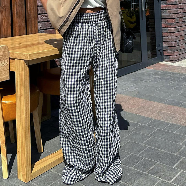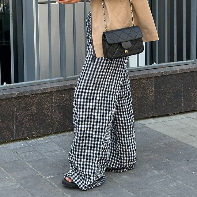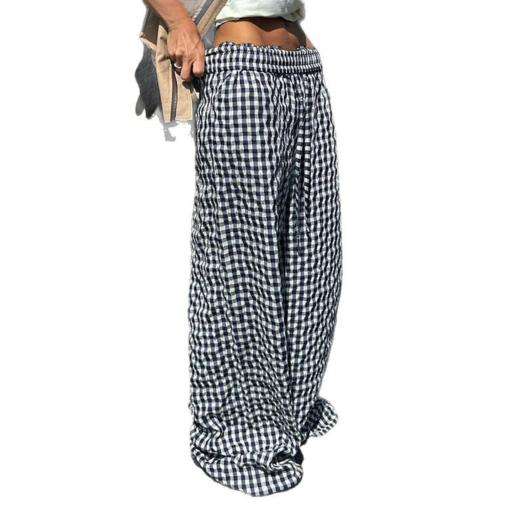 American retro high-waisted loose wide-leg pants women's autumn new drawstring elastic waist drape straight casual plaid pants
