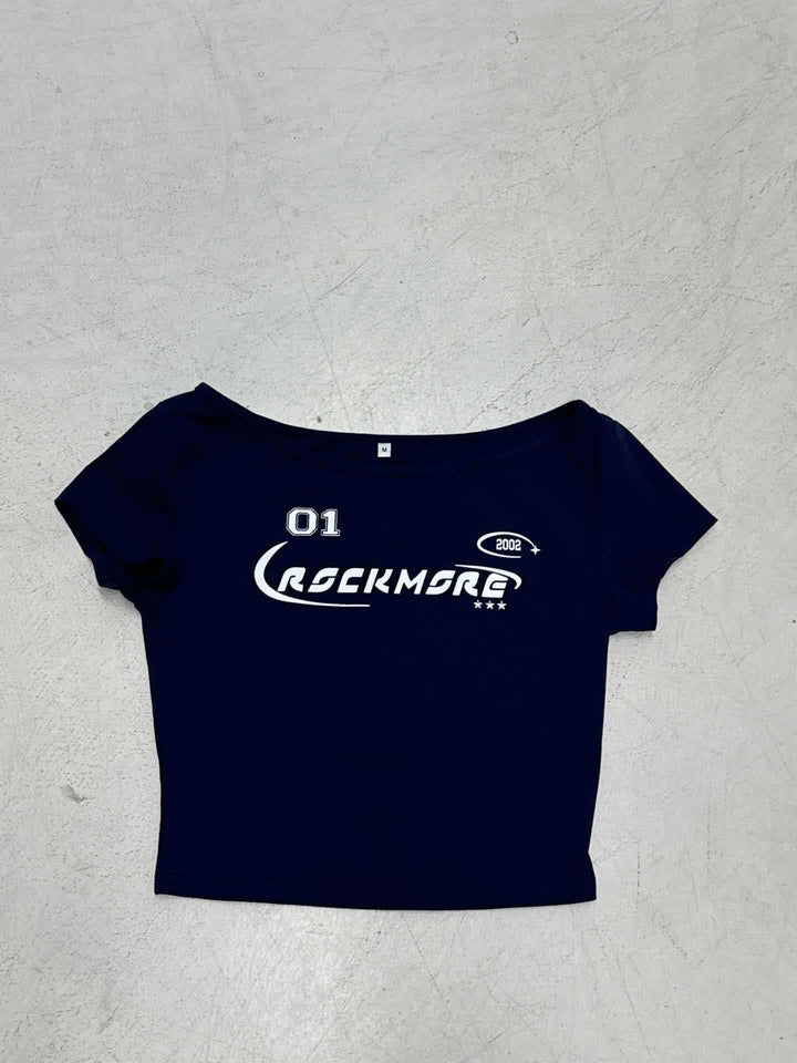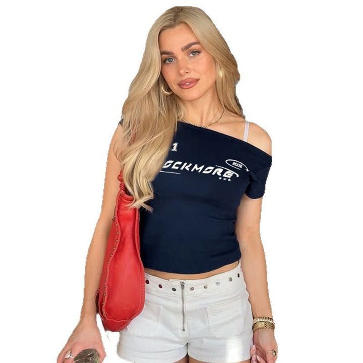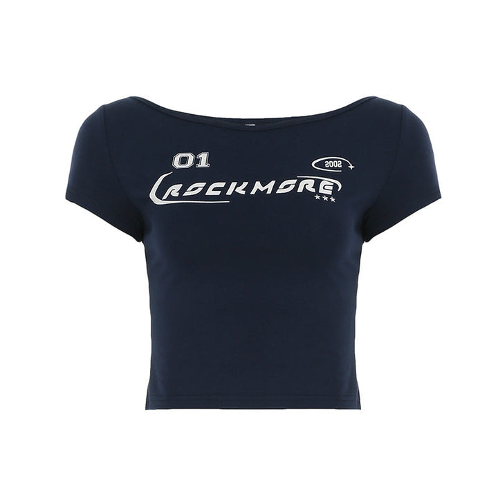 American Spice Girl Casual Top Letter Printing Large Crew Neck Slash Shoulder Two Wear Short Sleeve T-Shirt 2025 Summer New Women