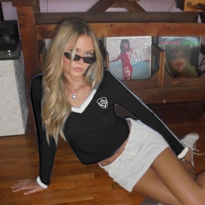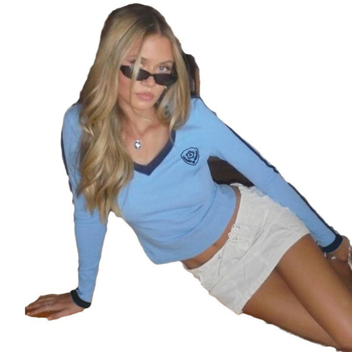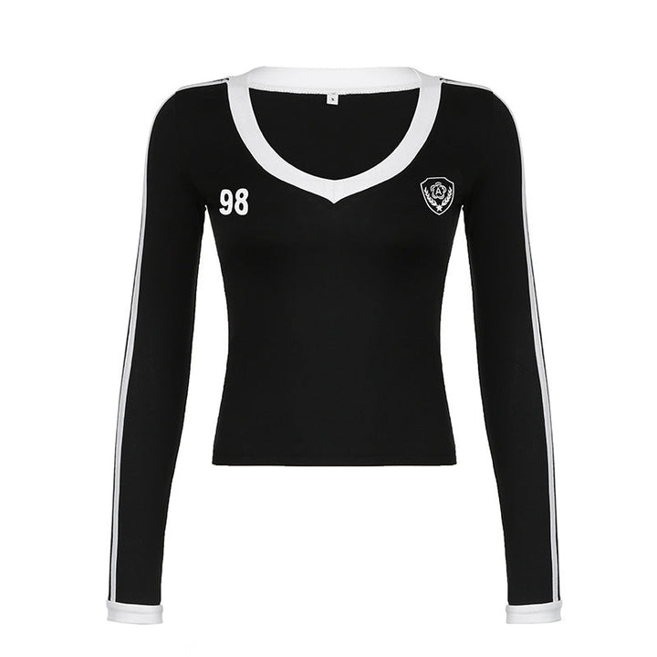 American Spice Girl Long Sleeve T-Shirt 2024 Autumn New Slim-Fit V-Neck Digital Stripe Splicing Basic Pullover