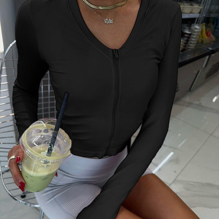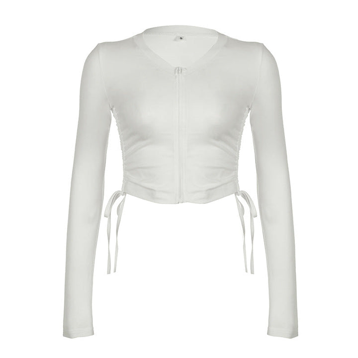 American sports style V-neck slim-fitting long-sleeved top solid color zipper cardigan drawstring casual versatile basic T-shirt women