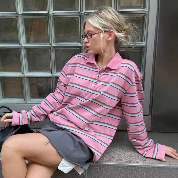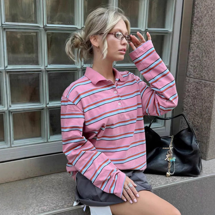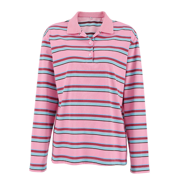 American Sweet and Cool Versatile Striped POLO Shirt 2025 Spring Cross-border Design Loose Lapel Long Sleeve Top Women's Clothing