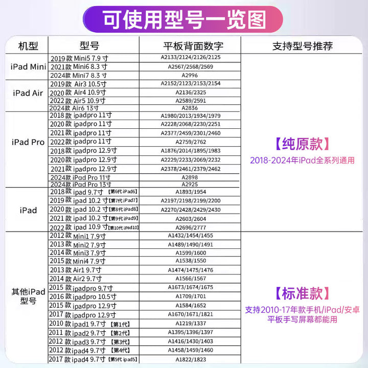 [Official standard] iPad 2010-17 fully compatible C port flash charging tilt pressure sensitive power display., Only applicable to Apple iPad models, please look for the model and consult customer service., [Official pure original model] ipad2018-2025 is fully compatible with 0 delay and continuous touch tilt pressure., [Official pure original model] Applicable to iPad Pro11-13 inch model 0 delayed continuous touch tilt pressure sensitive power display., [Official pure original] Applicable to iPad 6/7/8/9/10 generation 0 delayed continuous touch tilt pressure sensitive power display., [Official pure original] Applicable to iPad Air3/4/5/60 delayed continuous touch tilt pressure-sensitive power display., 【官方纯原款】适用iPad Mini5/6/70延迟不断触倾斜压感电量显示, 【官方标准款】iPad 2/3/4/5C口闪充电倾斜压感电量显示., 【官方标准款】iPad Air1/2C口闪充电倾斜压感电量显示, 【官方标准款】iPad Mini1/2/3/4C口闪充电倾斜压感电量显示. |