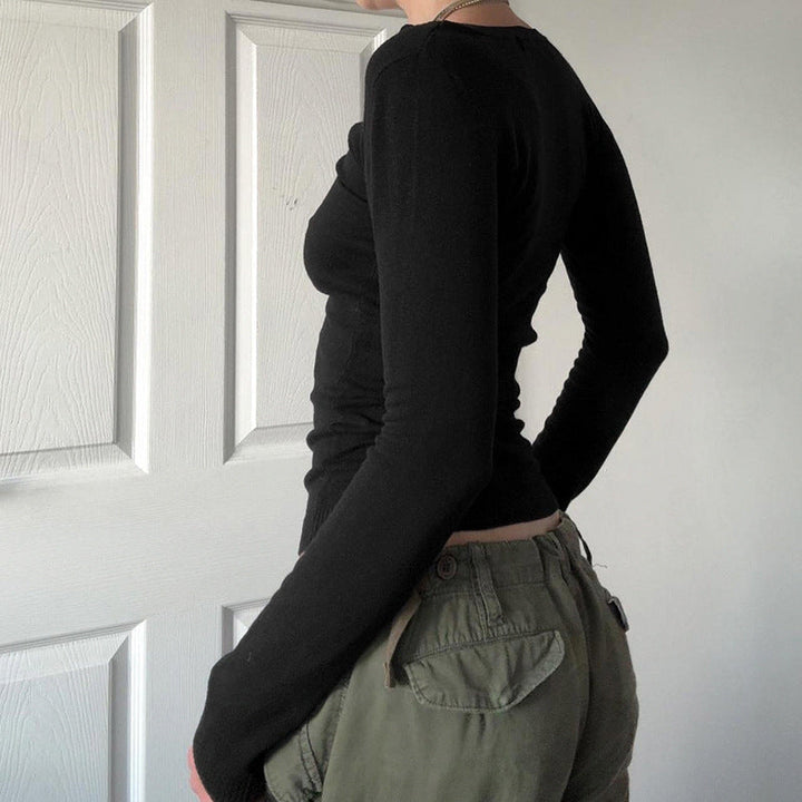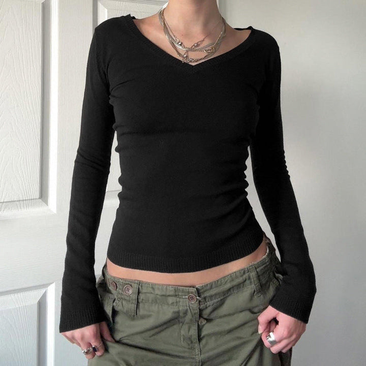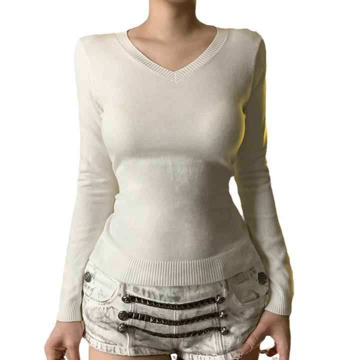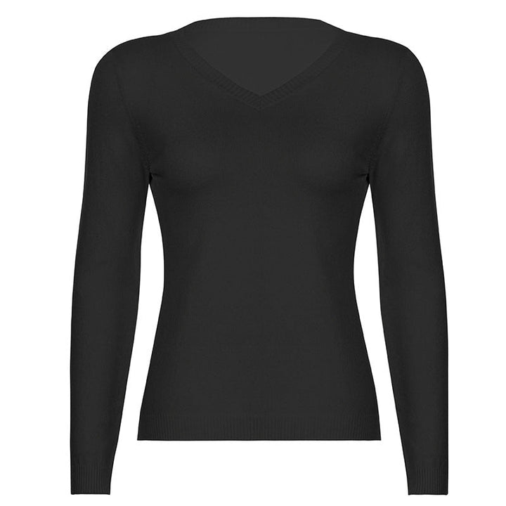 Autumn and winter American simple solid color V-neck sweater bottoming shirt basic T-shirt front shoulder Spice Girl slim-fit versatile sweater top