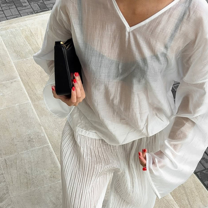 Autumn European and American women's clothing design sense Tencel see-through light and thin long-sleeved v-neck top, loose sunscreen blouse