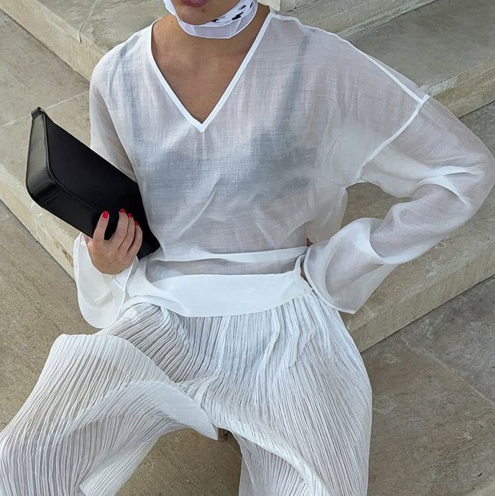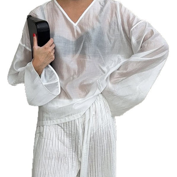 Autumn European and American women's clothing design sense Tencel see-through light and thin long-sleeved v-neck top, loose sunscreen blouse
