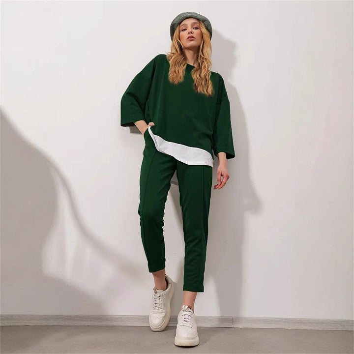 Autumn new long-sleeved suit, fake two-piece loose sweater suit, design sense jumper, straight casual trousers for women