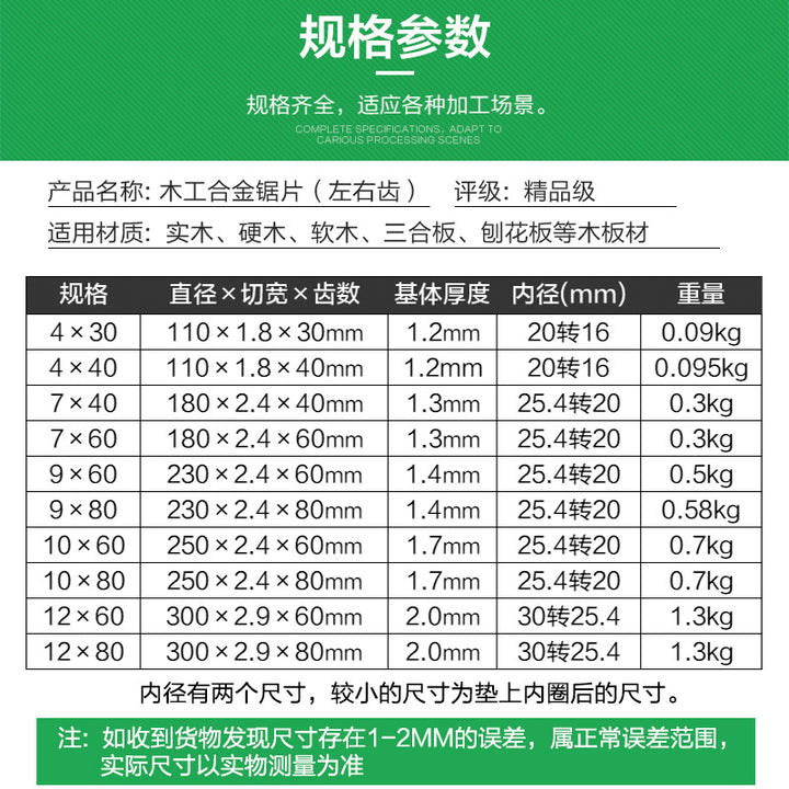 Industrial grade: 4 inches × 30 teeth, Industrial grade: 4 inches × 40 teeth, Industrial grade: 7 inches × 40 teeth, Industrial grade: 7 inches × 60 teeth, Industrial grade: 9 inches × 60 teeth, 工业级:9寸×80齿, 工业级:10寸×60齿, 工业级:10寸×80齿, 工业级:12寸×60齿, 工业级:12寸×80齿, Low-end model: 4 inches × 30 teeth, Low-end model: 4 inches × 40 teeth |