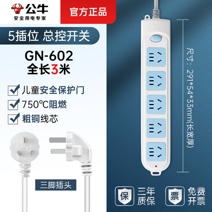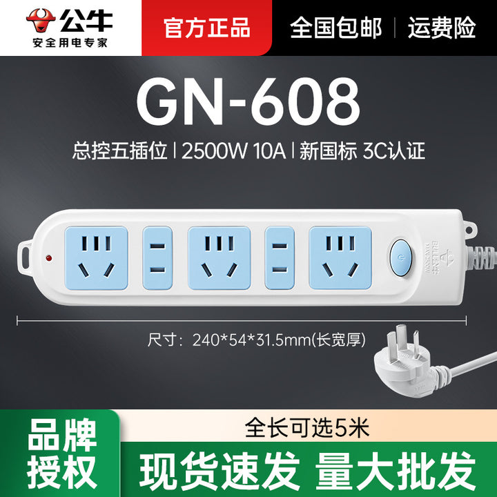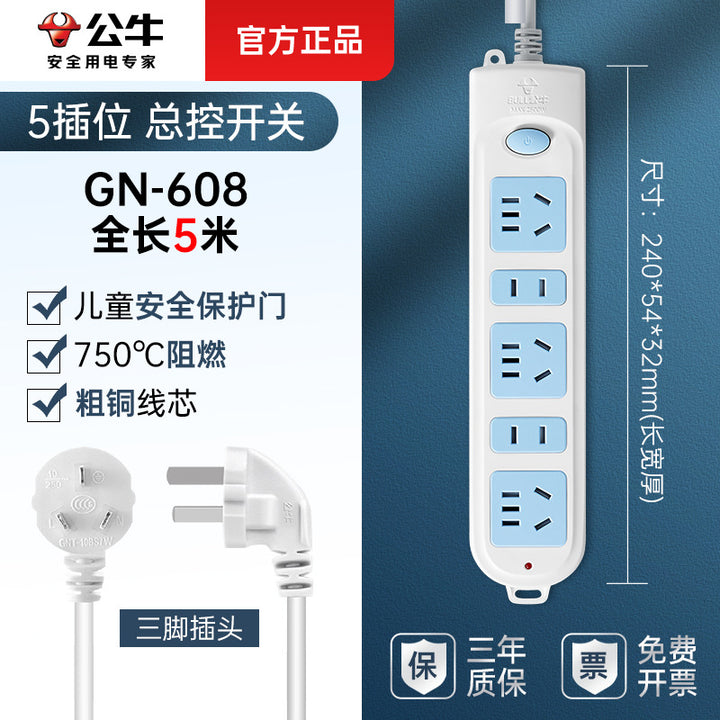 Bull cable plug GN-608 master control five plug 5m household socket plug-in board plug-in board drag board power strip