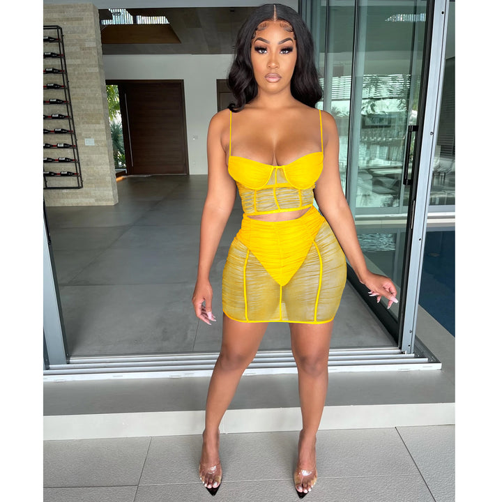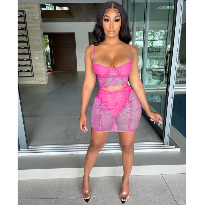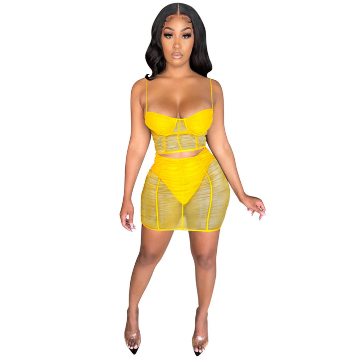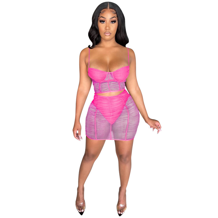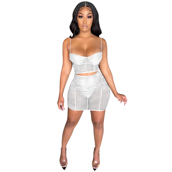 C5176 Spot Summer Fashion Sexy Suspender Solid Color Milk Silk Mesh Yarn Perspective Hip Wrap Short Skirt Two-piece Set Women