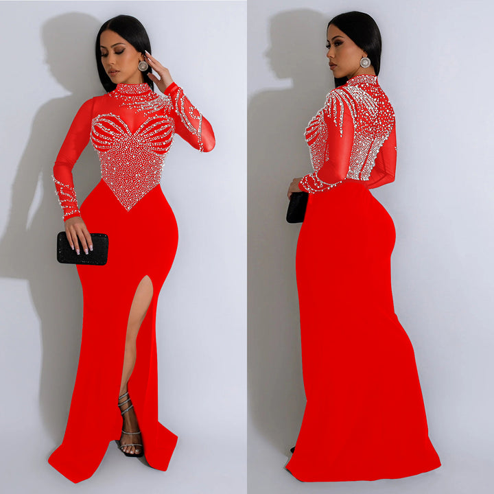 C6825 Cross-border , , Europe and the United States fashion women's clothing, solid color mesh yarn, hot diamond split long dress, dress