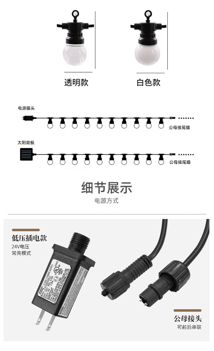 Low voltage 24V plug-in model 5m 10 light, 低压24V插电款10米20灯, 普亮遥控太阳能款5米10灯(1200毫安容量), 普亮遥控太阳能款10米20灯(1200毫安容量), 高压220V插电款5米10灯, High voltage 220V plug-in model 5m 10 light, High voltage 220V plug-in 10 meters 20 lights, 24V high power transformer - can bring 20 strings (always on), 24V transformer - can be brought within 4 strings (always on), 高压常亮插头-可带10串以内(常亮), 高亮遥控太阳能款5米10灯(3600毫安容量), 高亮遥控太阳能款10米20灯(3600毫安容量) |