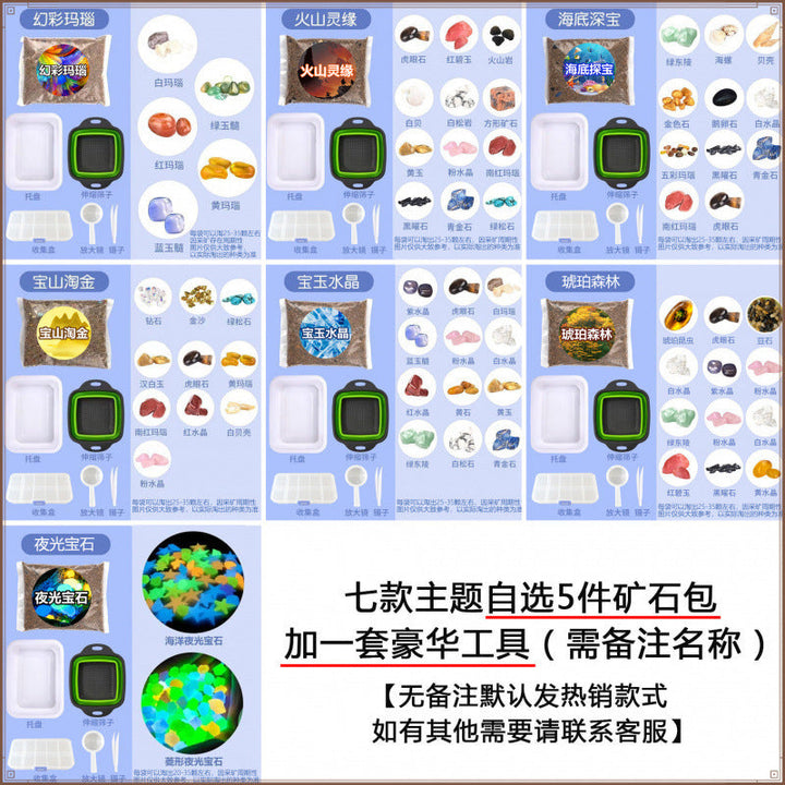 Symphony Agate [Deluxe telescopic sieve + full set of tools], Volcano Lingyuan [Deluxe telescopic sieve + full set of tools], Undersea Treasure Exploration [Deluxe Retractable Large Leaf Screen + Full Set of Tools], Baoshan Gold Rush [Deluxe telescopic large sieve + full set of tools], Baoyu Crystal [Deluxe telescopic large sieve + full set of tools], Amber Forest [Deluxe telescopic sieve + full set of tools], [2 themed ore packs of your choice] 1 set of luxury tools will be given as a gift., [3 themed ore packs of your choice] 1 set of luxury tools will be given as a gift., [4 themed ore packs of your choice] 1 set of luxury tools will be given as a gift., [5 themed ore packs of your choice] 1 set of luxury tools will be given as a gift., Symphony agate (the paperback version will send some tools), Volcano Lingyuan (the simplified version will send some tools), Undersea treasure hunting (the simplified version will send some tools), Baoshan Gold Rush (the simplified version will send some tools), Baoyu crystal (the simplified version will send some tools), 1 bag of ore replenishment bag (no remarks for hot-selling models) |