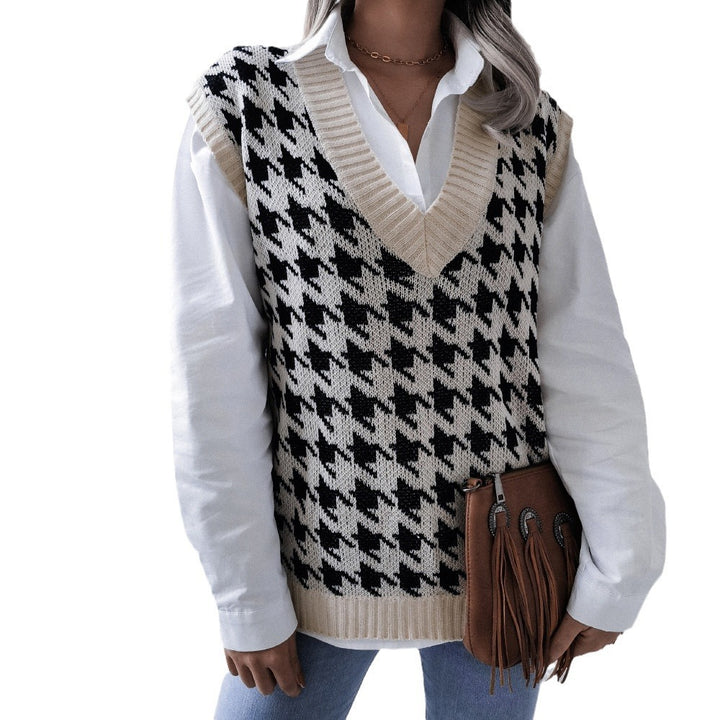 Clearance 2023 autumn and winter European and American V-neck thousand bird grid casual loose knitted vest sweater vest,
