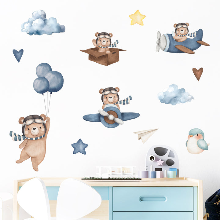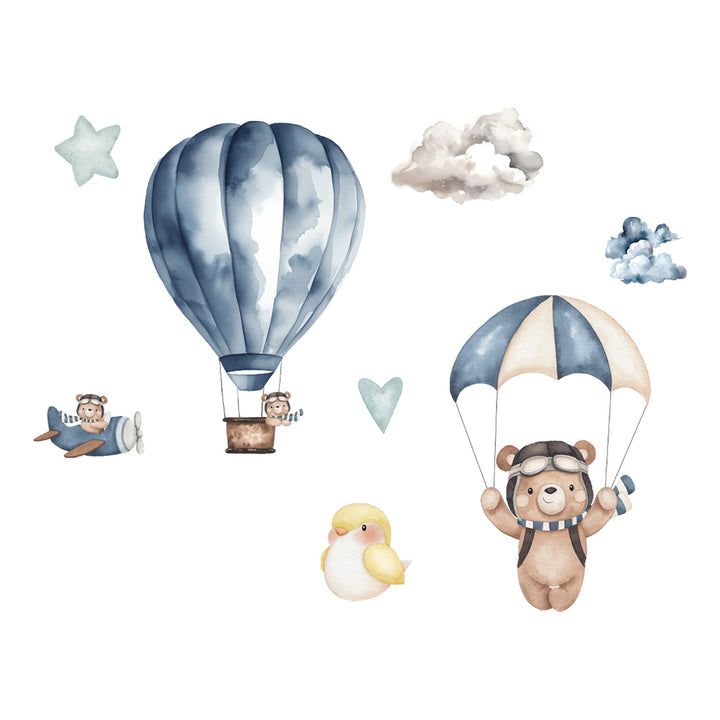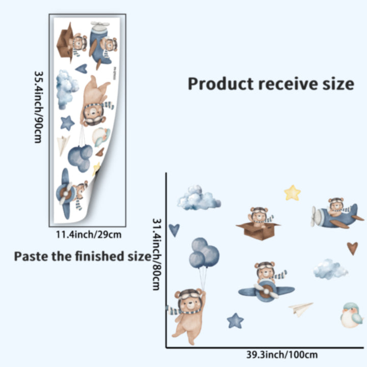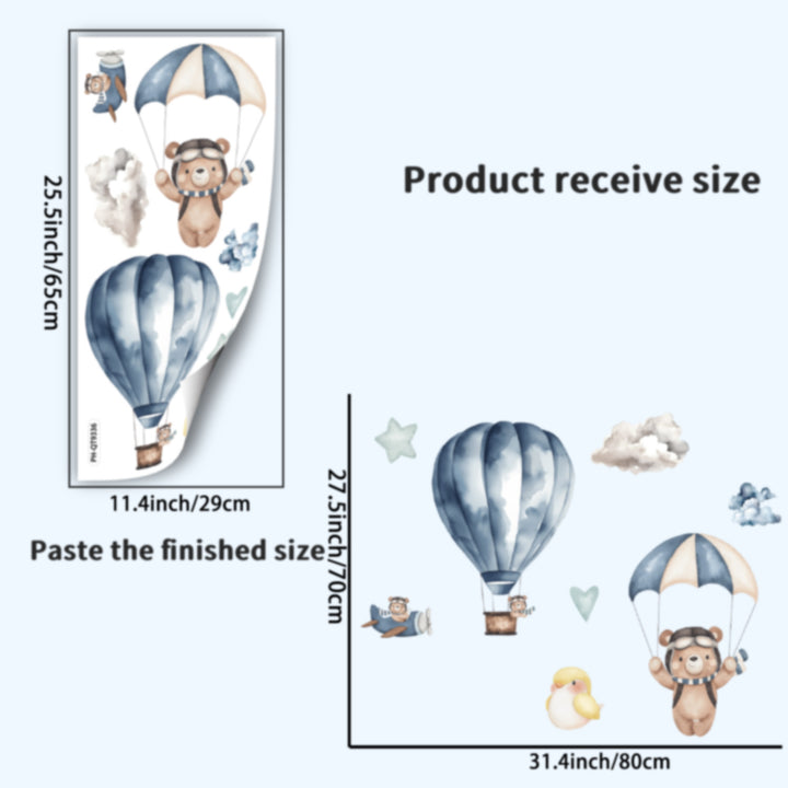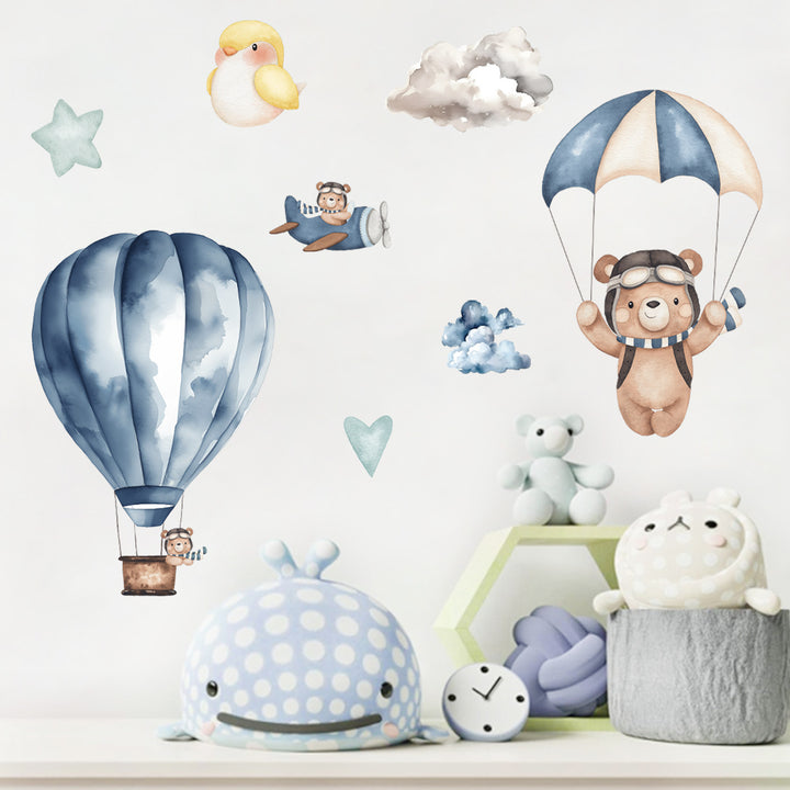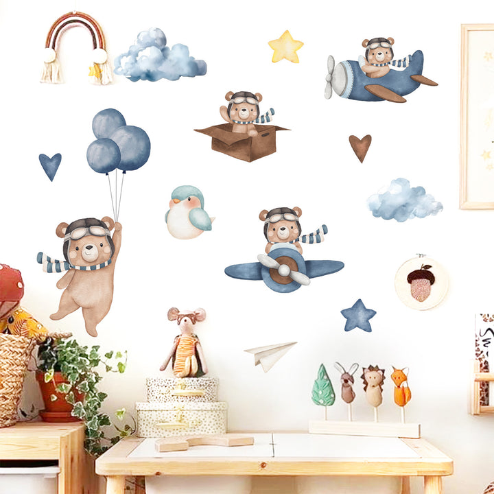 Cross-border cute cute cute blue bear plane landing hot air balloon children's room wall sticker