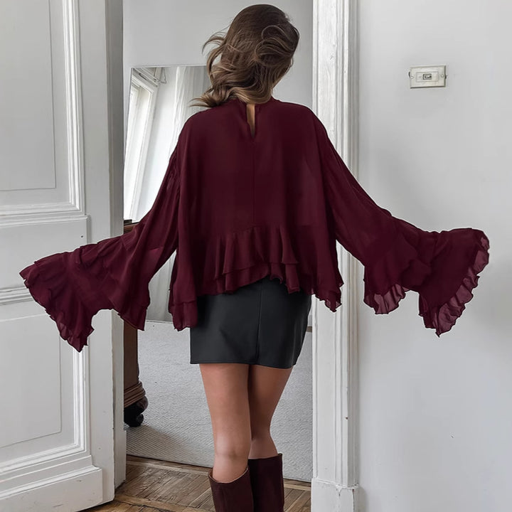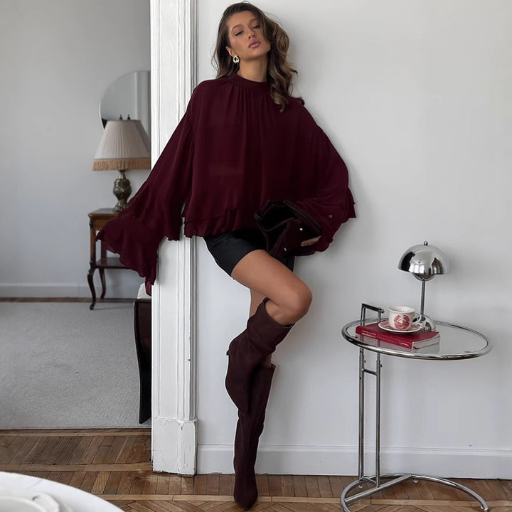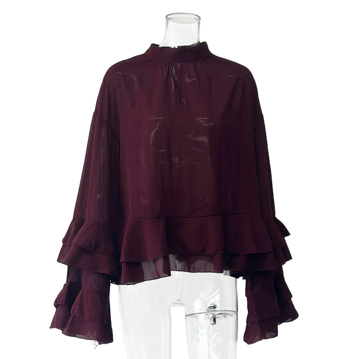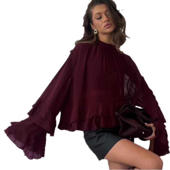 Cross-border Europe, America and 2025 autumn new women's clothing solid color chiffon top ruf...