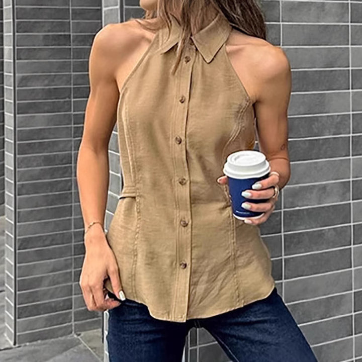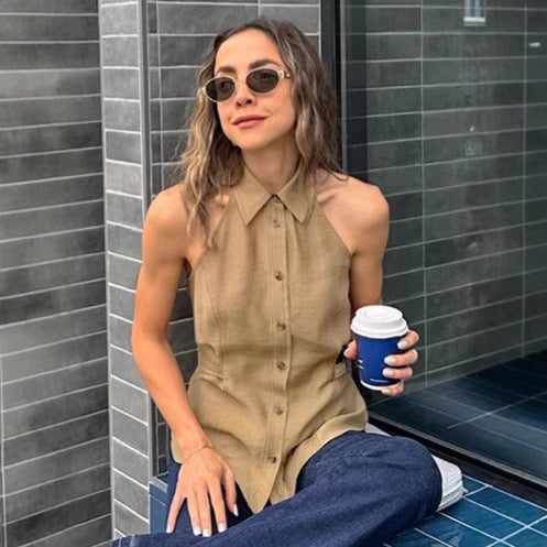 Cross-border European and American commuting khaki lapel vest women's 2025 autumn simple waist with sleeveless top women's clothing