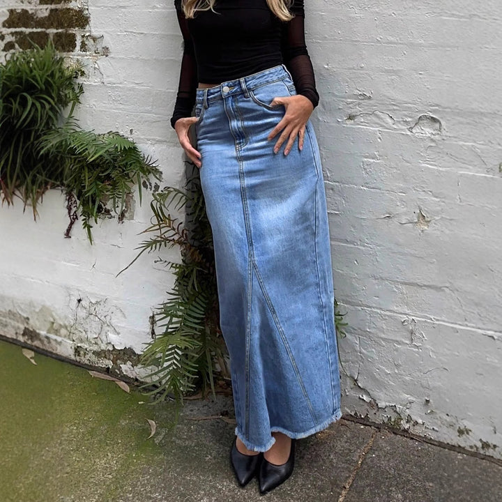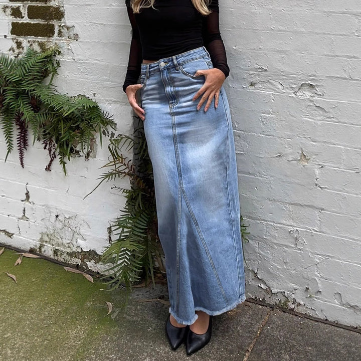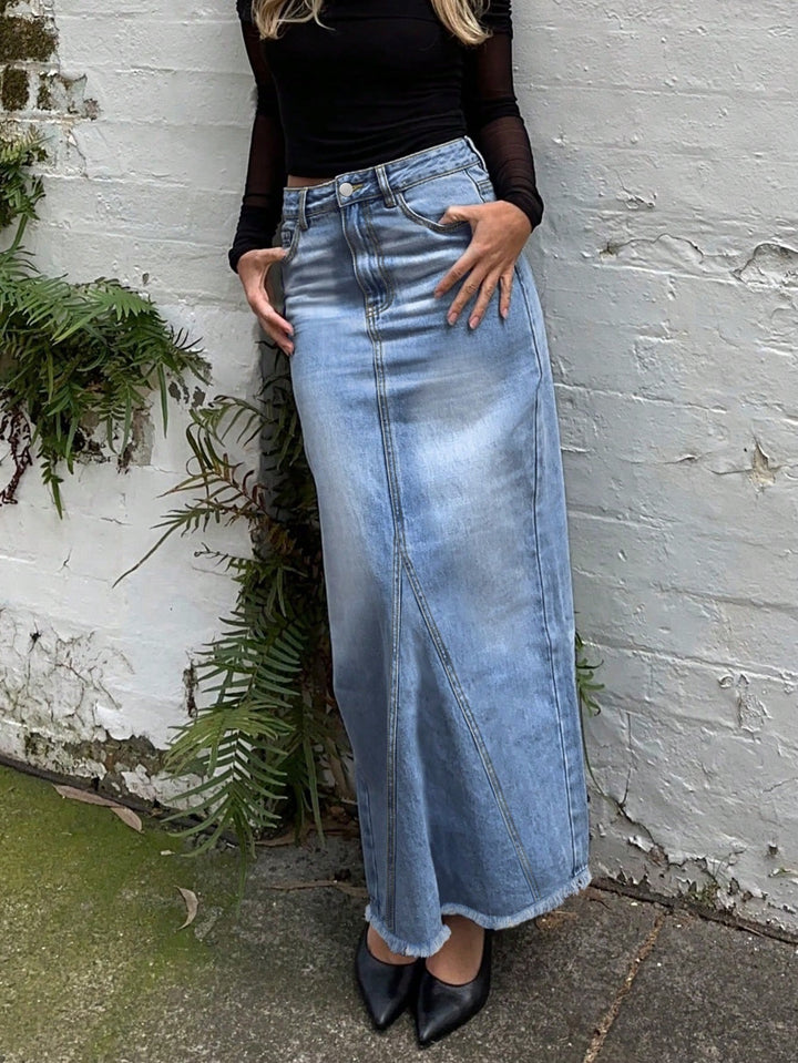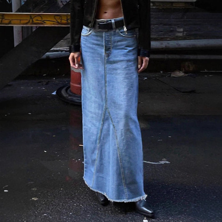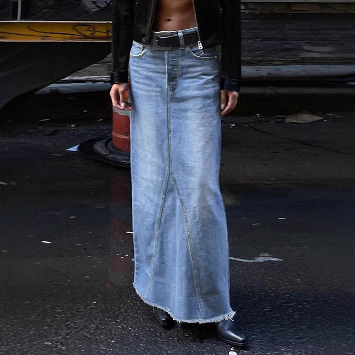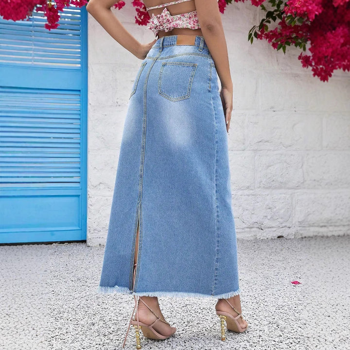 Cross-border European and American denim skirt women's 2025 spring versatile split fork washed medium and long skirt washed A-shaped skirt