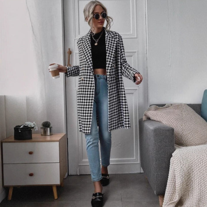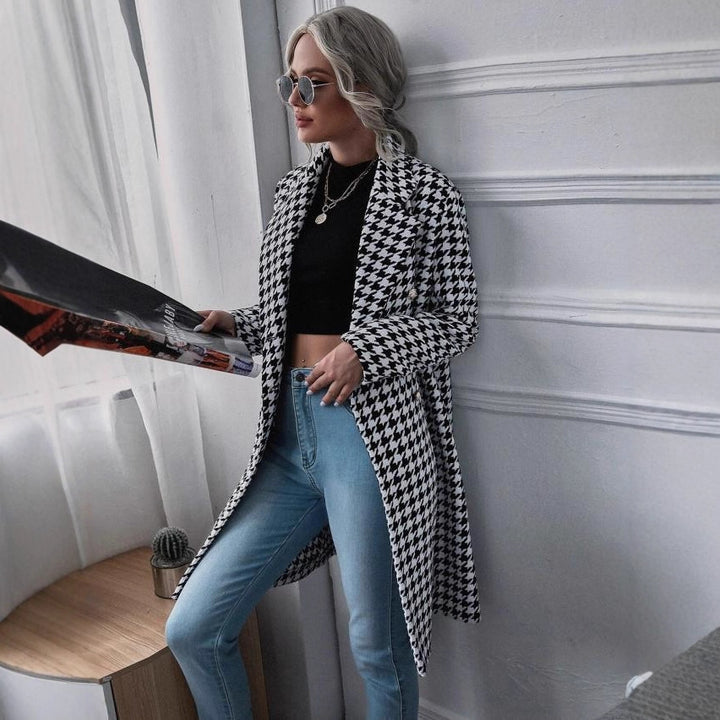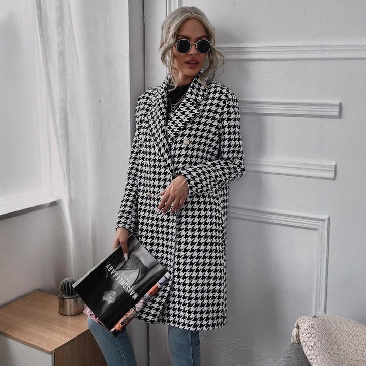 Cross-border European and American Express autumn and winter new fashion thousand bird grid coat printed long double-breasted woolen coat