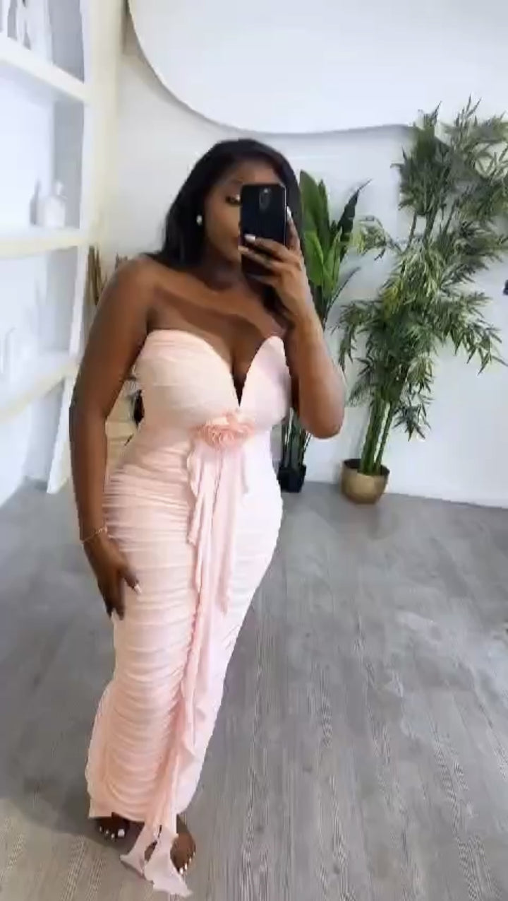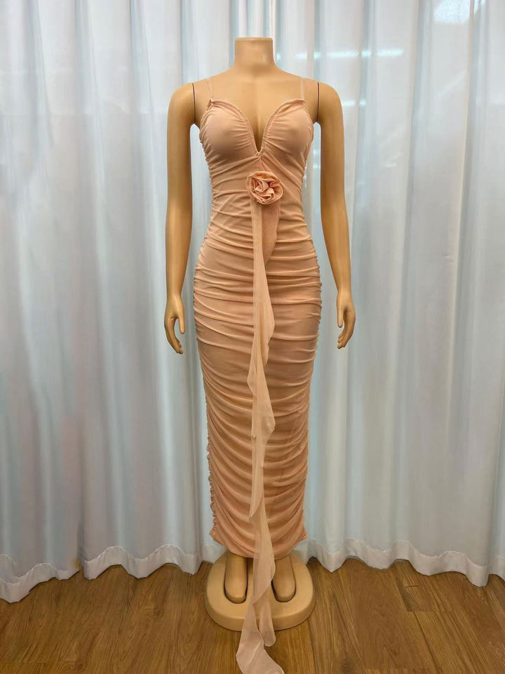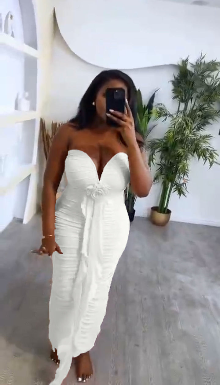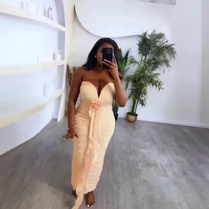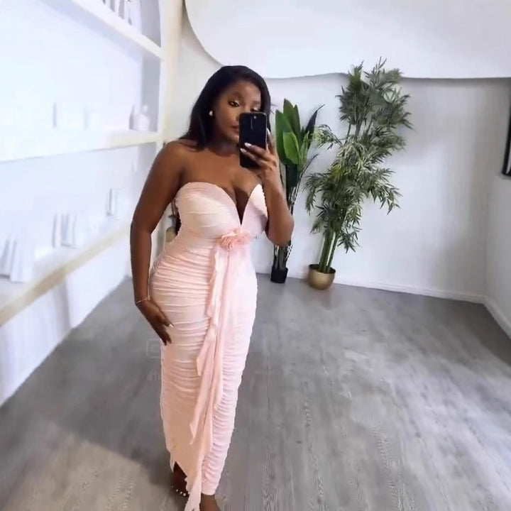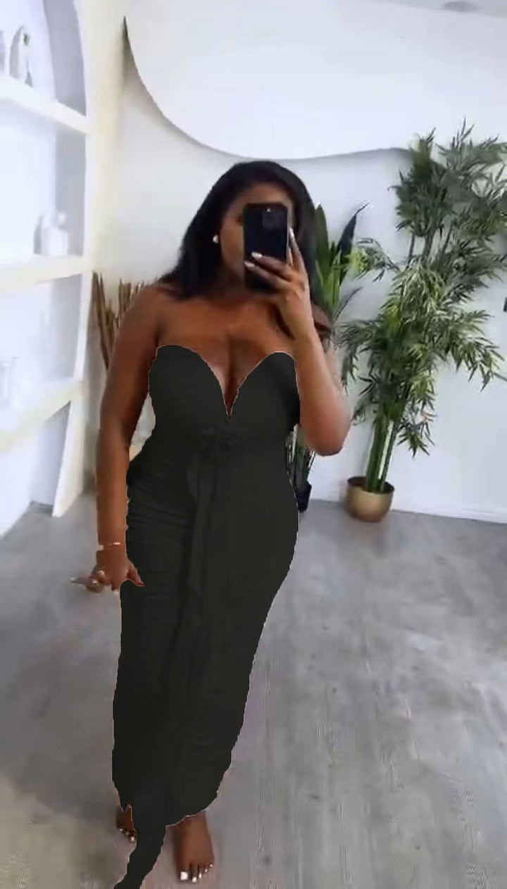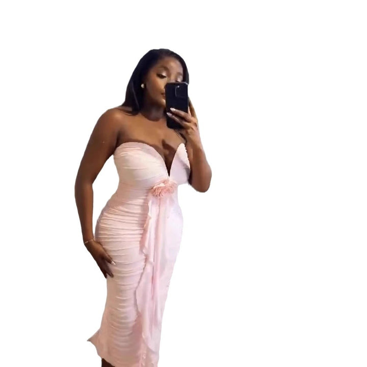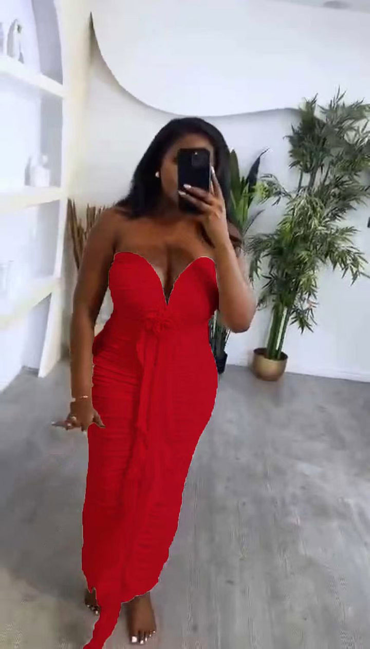 Cross-border European and American new tube top deep V sexy slim and thin backless streamer split hip wrap dress women's clothing