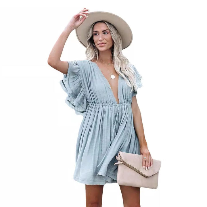 Cross-border European and American summer skirt bamboo cotton single-breasted belt beach sunscreen blouse sexy backless dress