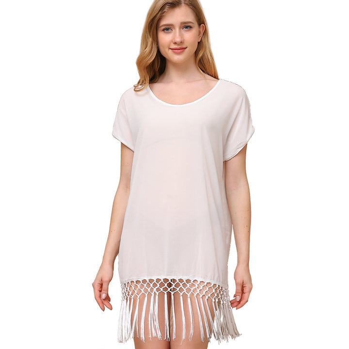 Cross-border European and American summer women's clothing knotted and fringed splicing solid color loose bat sleeves sweet wind sunscreen beach bl...