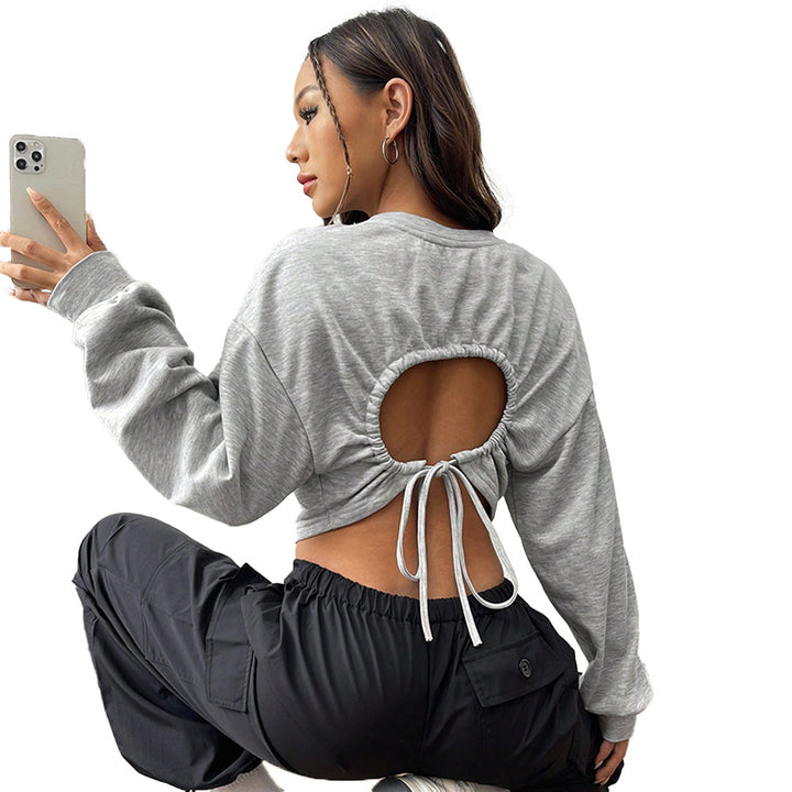 Cross-border European and American women's clothing high waist leakage navel drawstring waist sweater wear short large version loose long sleeve t-...